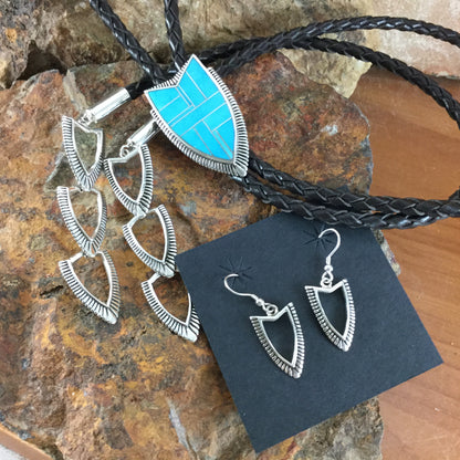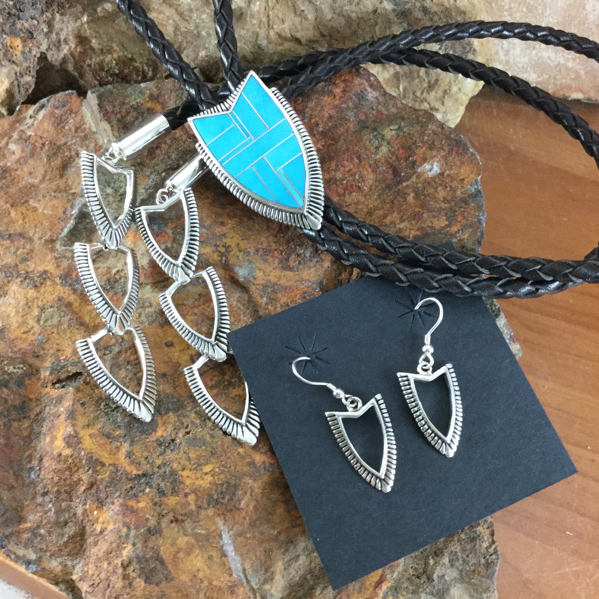 This Leather Bolo Tie from David Rosales features a Sterling Silver Bola setting with Inlay of Kingman Turquoise. Smaller overall size makes it appropriate for women and is often referred to a 'Gola'. Tips also are Sterling Silver. Includes matching Earrings.