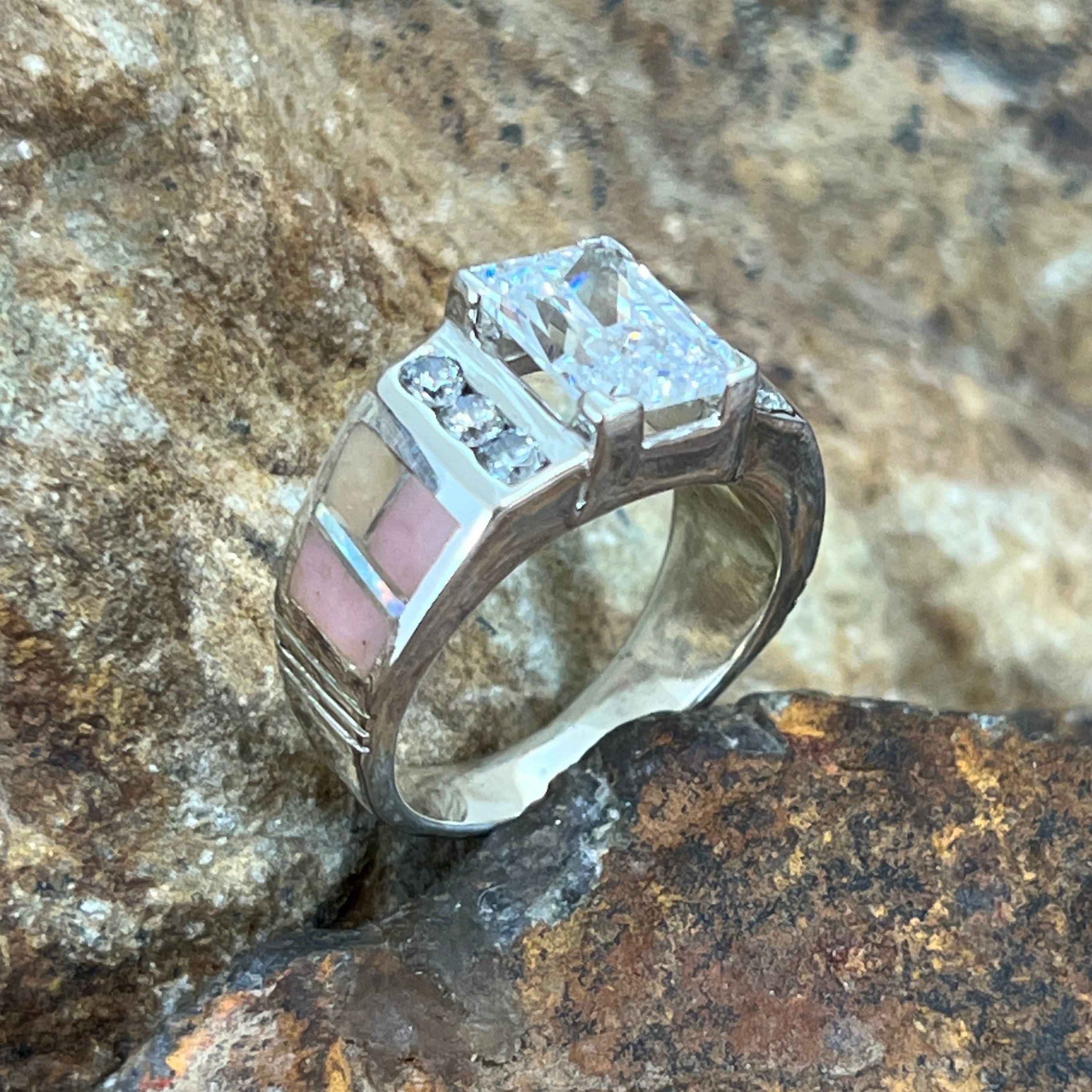 This beautiful Sterling Silver Ring, is now part of the Make Me Blush Collection, features Rhondonite, Pink Peruvian Opal and White Lab Opal with brilliant Center Stone Cubic Zirconia and six small Cubic Zirconia.