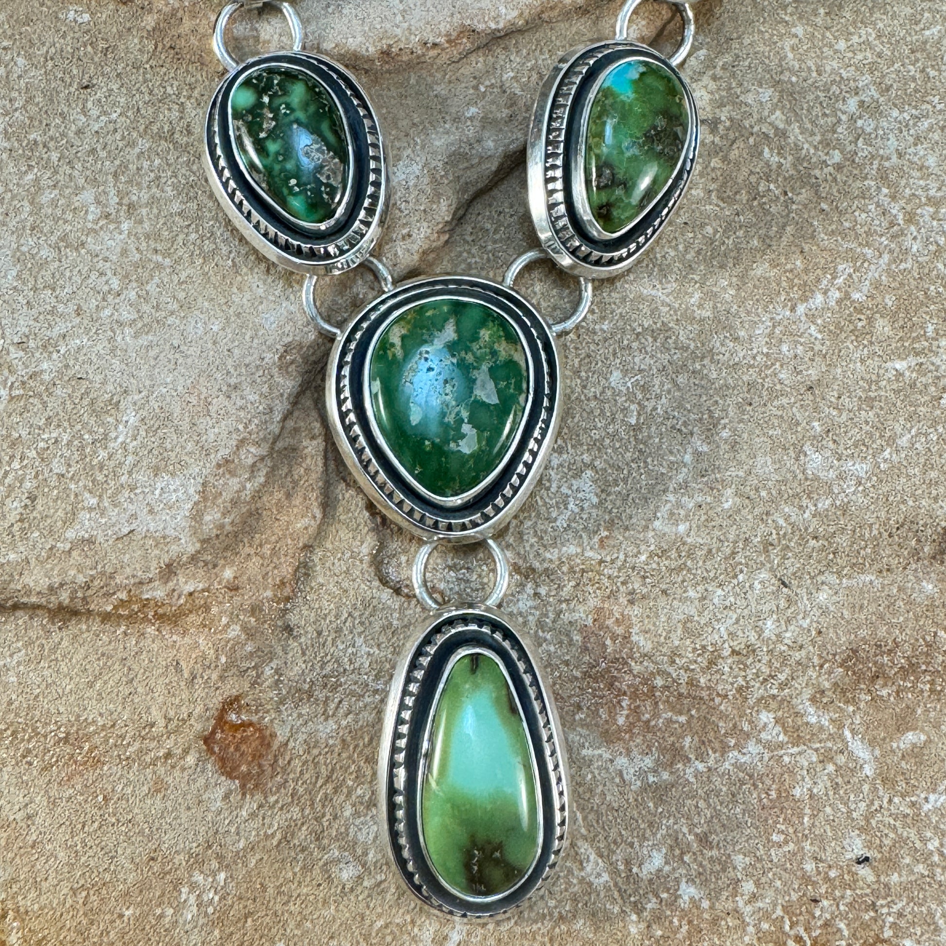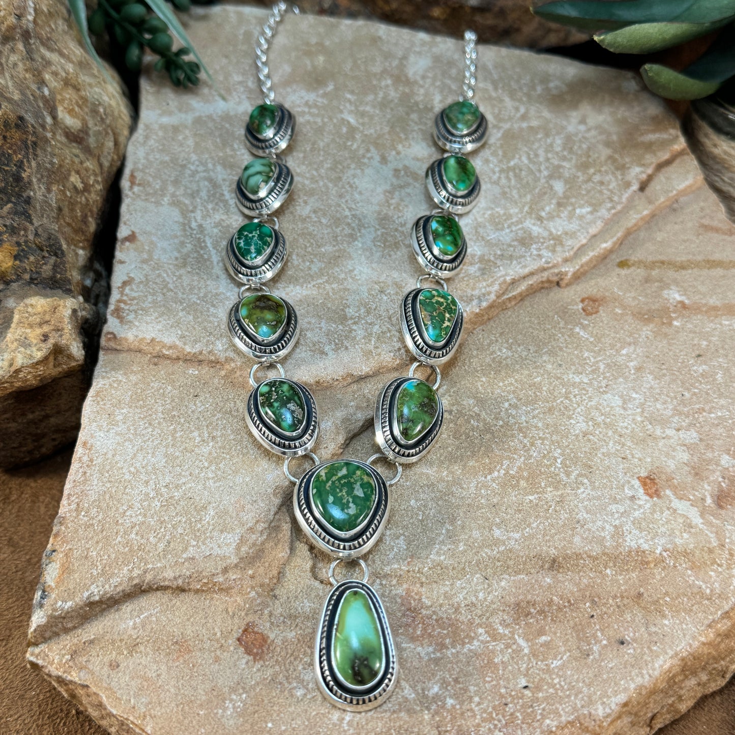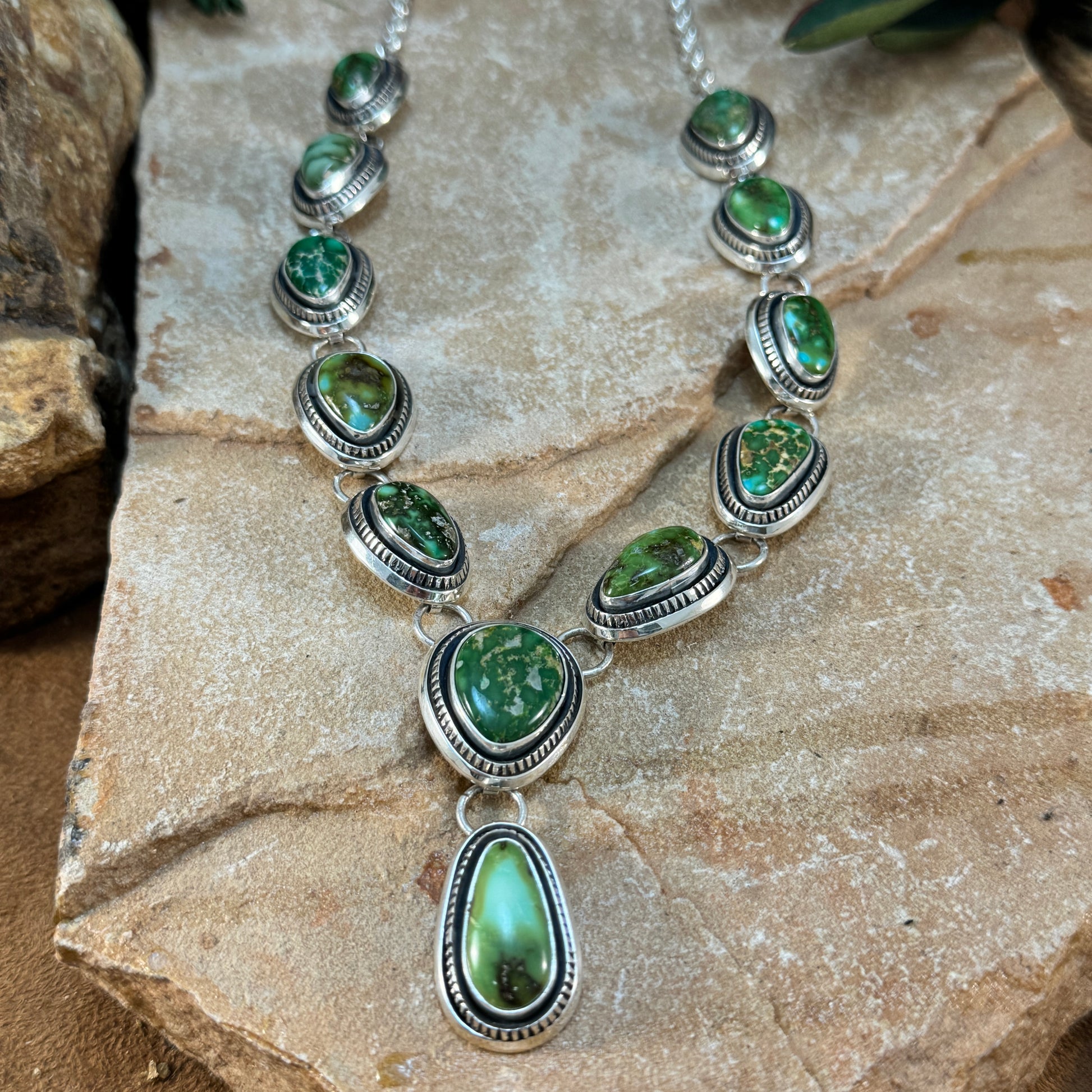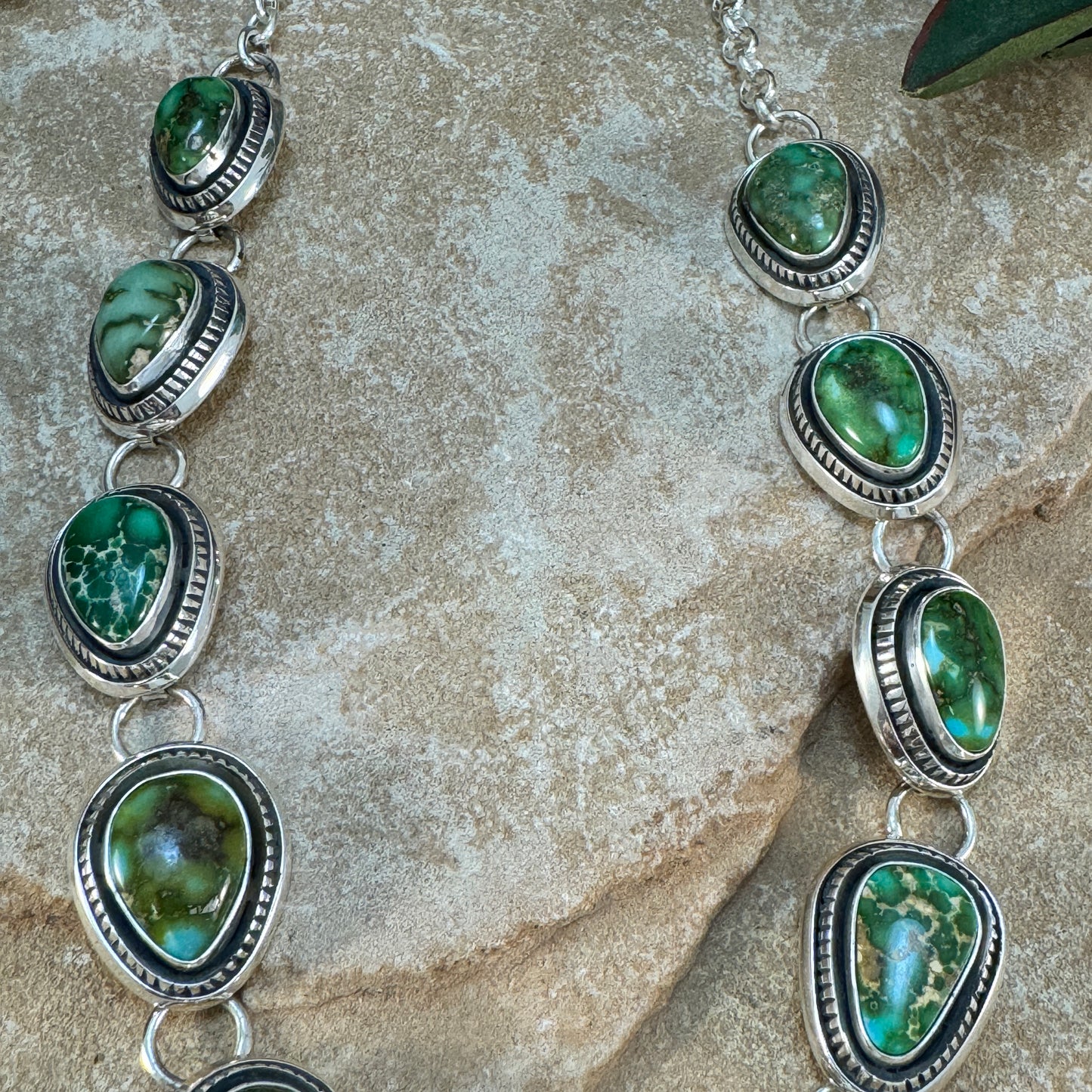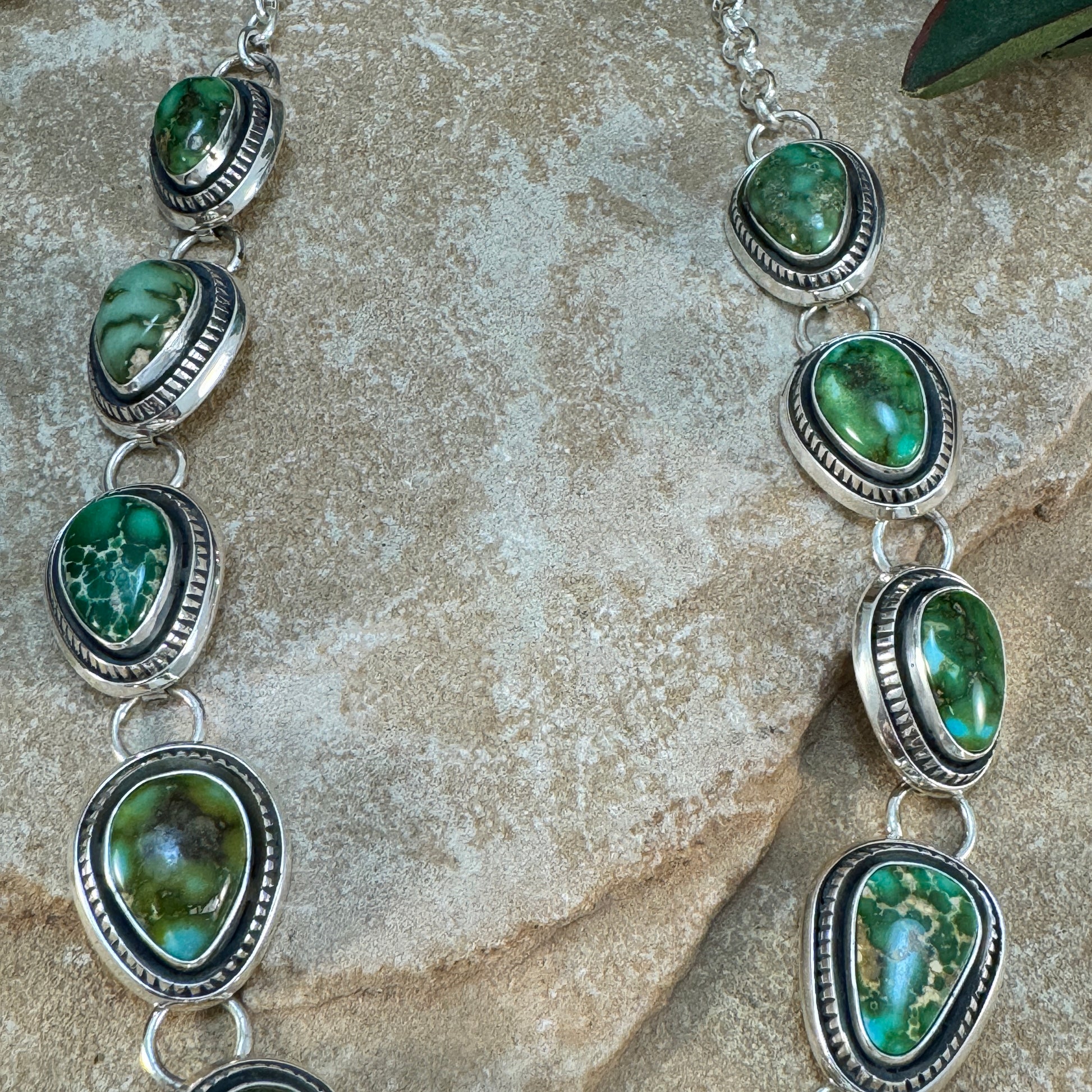 This Sterling Silver Sonoran Gold Turquoise Necklace is just spectacular. Created and Hand Crafted by Navajo Silversmith Leonard Nez. This Sterling Silver and Sonoran Gold Turquoise Necklace has the following features: