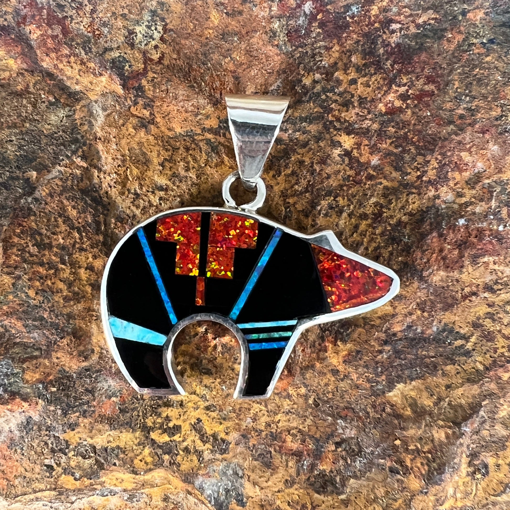 David Rosales Red Moon Fancy Inlaid Sterling Silver Pendant Bear