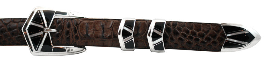 This stunning Ranger Belt Buckle Set is handcrafted in Sterling Silver and inlaid with Black Jade and White Mother of Pearl. Belt Buckle Width fits 1" leather strap.