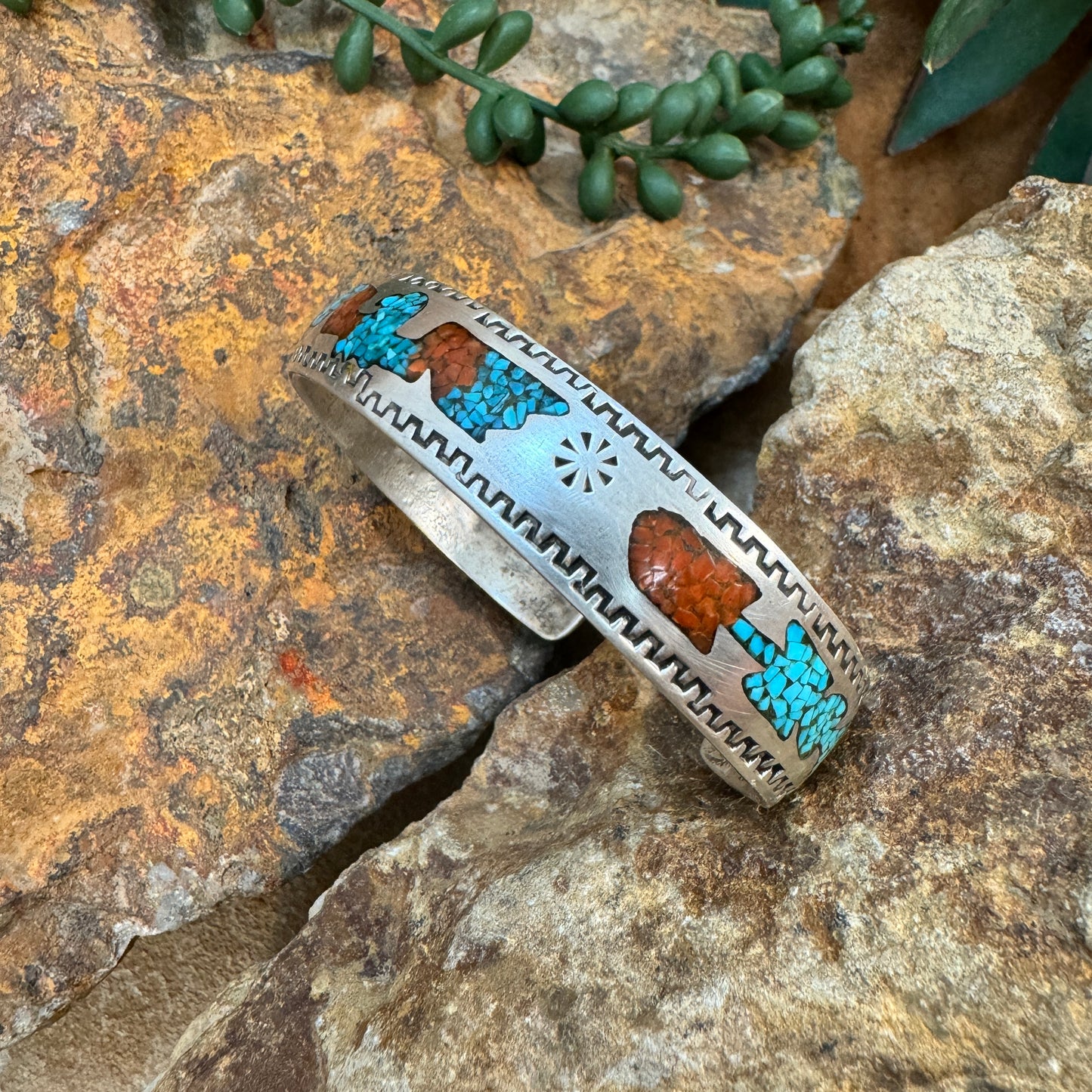Enjoy this beautiful Vintage Navajo Inlay Bracelet that was cast in Sterling Silver. This Bracelet features: