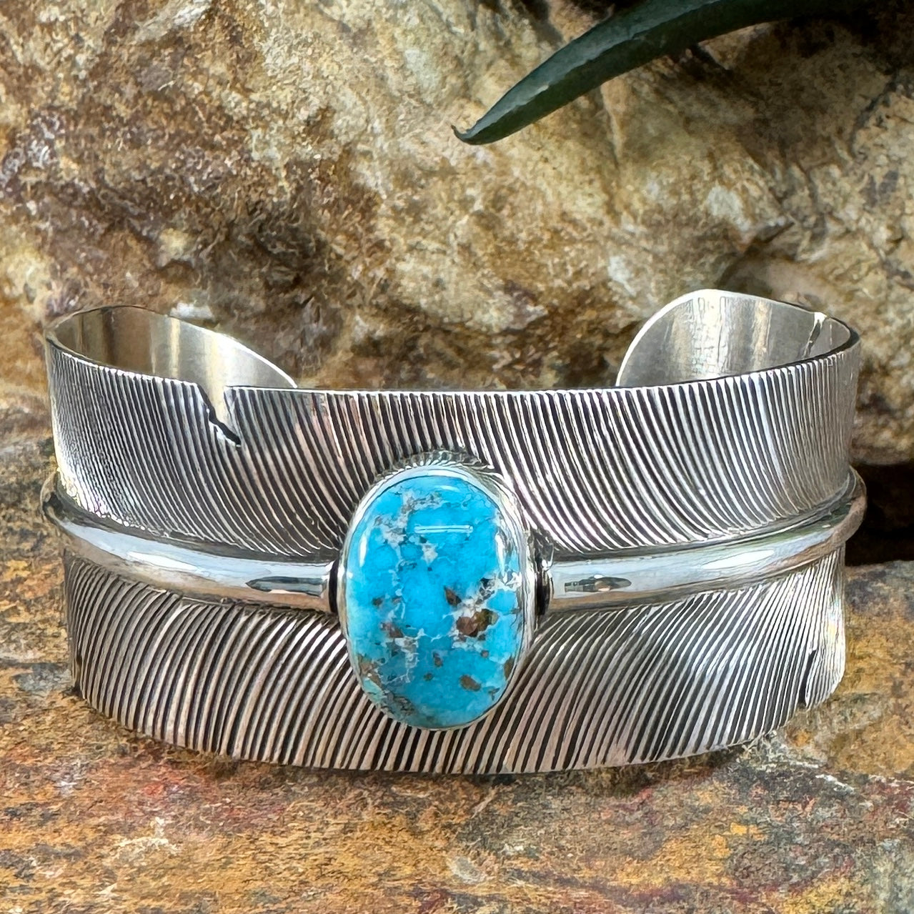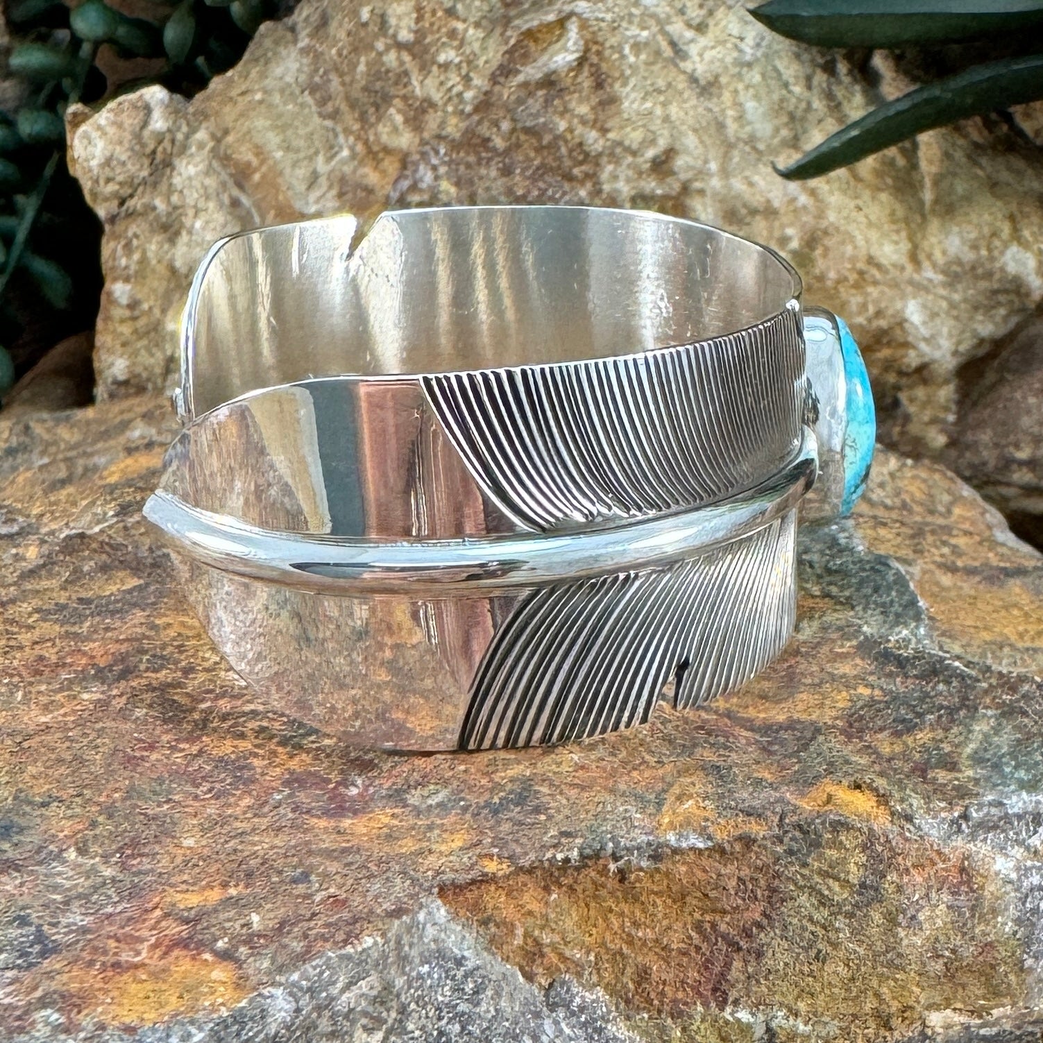 This beautiful Contemporary Sterling Silver Bracelet was created by Navajo Artist, Raymond Cruz. The beautiful Kingman Turquoise has a beautiful white & brown matrix. R Cruz incorporates a Feather Design. Note Colors may vary by computer monitor.