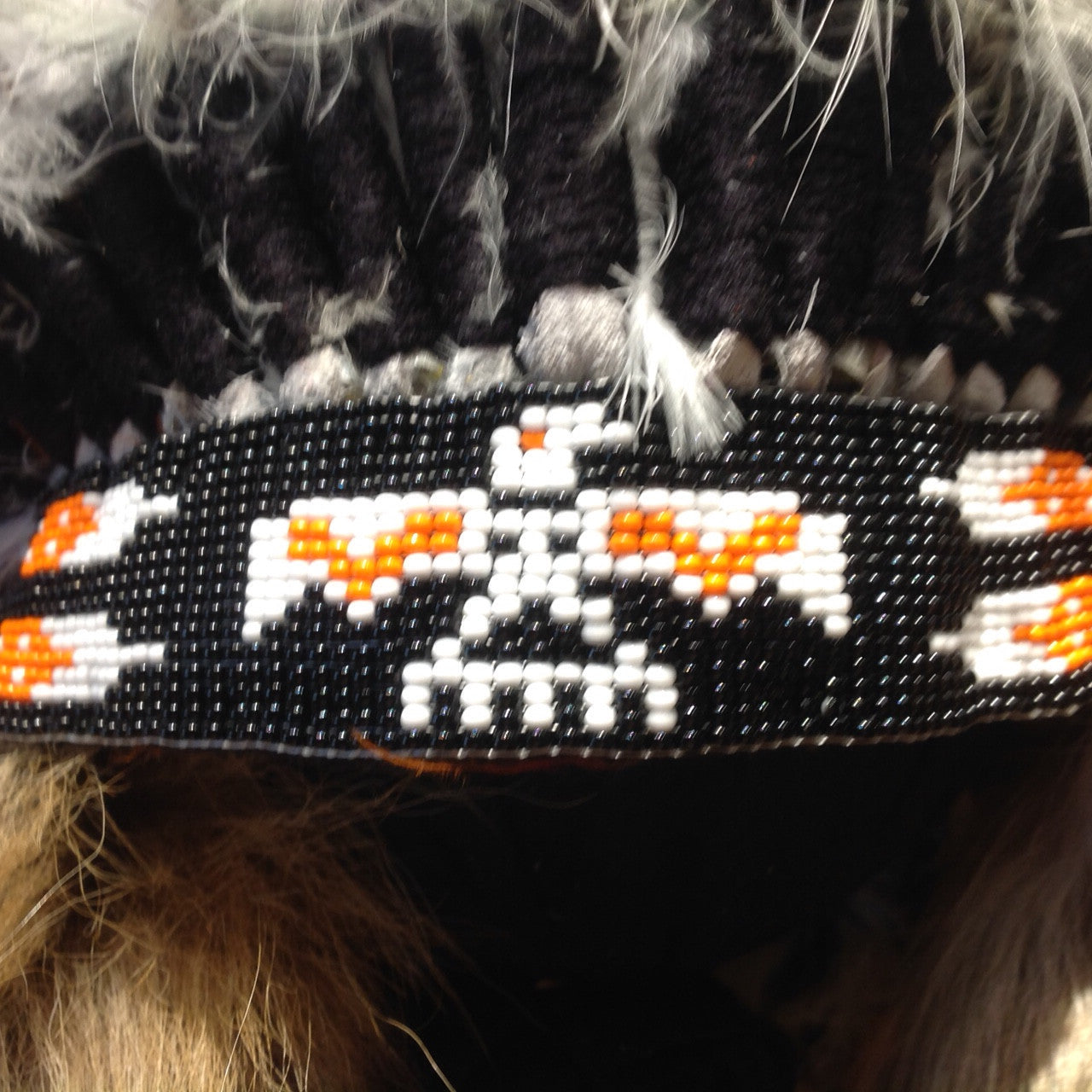 This Thunderbird Headdress is a reproduction of a Native American artifact. It was created and made by two Navajo artists, Linda Lee and Betsy Piaso, including intricate beadwork and painted feathers