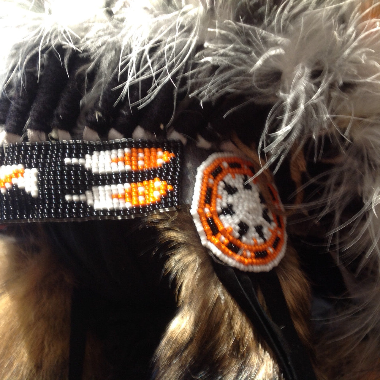 Each headdress we offer is handcrafted with care, guided by traditional designs and the artist’s interpretation of color, balance, and cultural symbolism. These pieces are created to honor the tribes they represent—not as costumes, but as respectful replicas suitable for ceremonial use or meaningful home display. Colors may appear differently depending on your screen settings; if the item is in stock, the photo reflects the exact piece you will receive. If out of stock, images are for reference only and new pieces may vary slightly in pattern or hue. While we do our best to accommodate special requests, changes can only be made using materials and colors already available in our current builds—custom-painted features or themed alterations (e.g., school or wedding colors) are not available. If you would like to pursue a design that blends color and style to match your intended use based on an existing piece, a 50% up-charge will apply to the listed price. Our goal is to respectfully represent the sacred meaning behind these works and to preserve their cultural integrity.