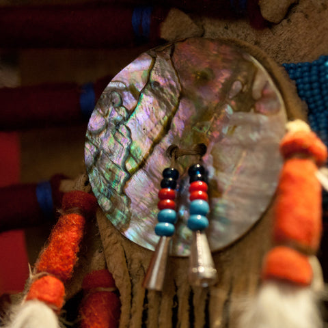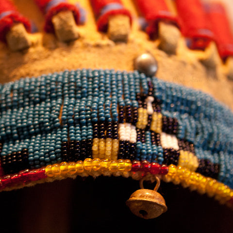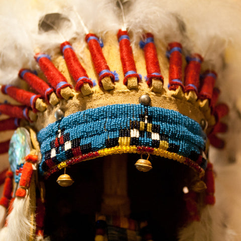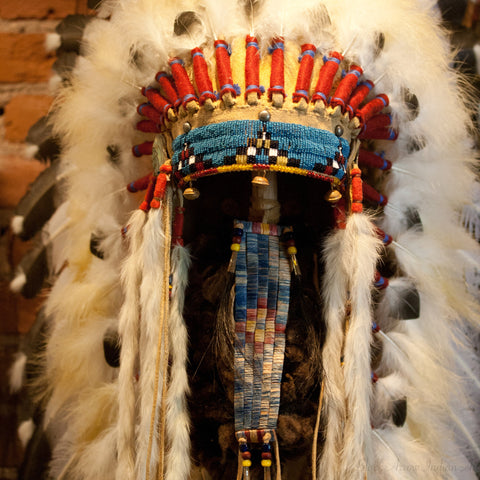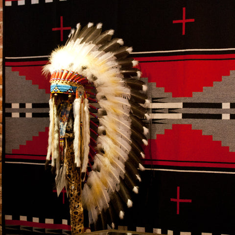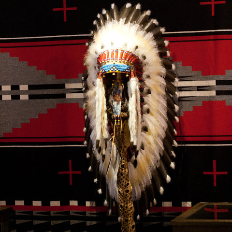 This Victory Headdress is of a plains-style construction. Measuring in at over 36" long, this piece is impressive in both size and craftsmanship. Each feather is carefully painted, and each bead is painstakingly stitched into a durable leather base to provide a lifetime of displayed beauty. Victory Headdress is Available Without or With Wall Mount Stand -- Make Selection.