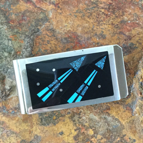 This eye-catching Sterling Silver Money Clip, as part of the Shadow Peak Collection, features Black Jade, Ithica Peak Turquoise and Kingman Turquoise in a Fancy Inlaid Pattern.