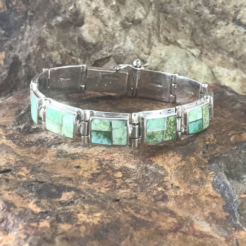 This beautiful Sterling Silver Link Bracelet features the Green, Blue and Yellow hues of Sonoran Gold Turquoise from Mexico.