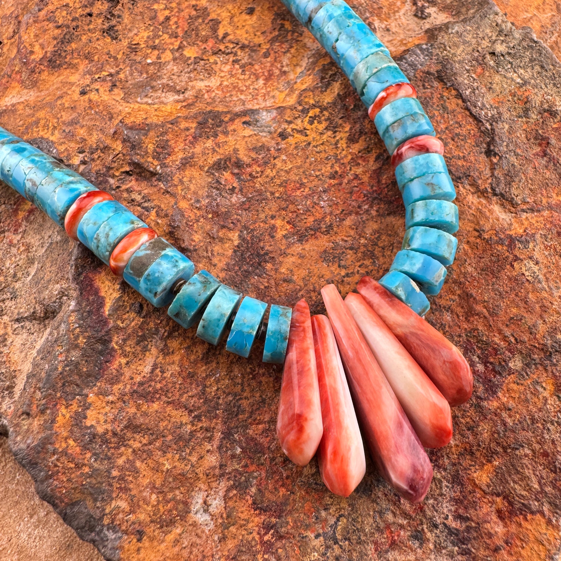 Turquoise & Spiny Oyster Heishi Necklace with Fan Drop 20"