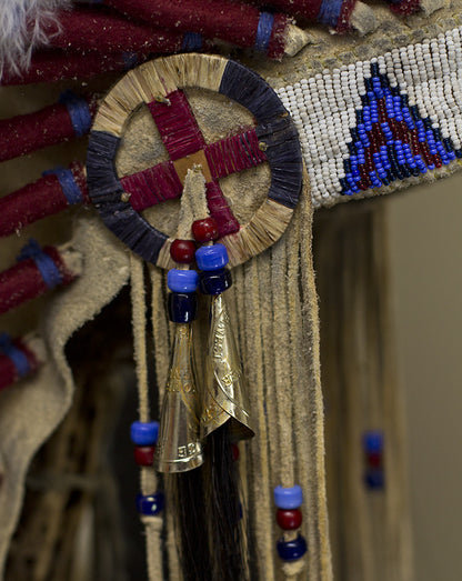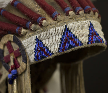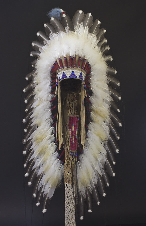 This Victory Headdress is of a plains-style construction. Measuring in at 36" long, this piece is stunning in both size and craftsmanship. Each feather is carefully painted, and each bead is painstakingly stitched into a durable leather base to provide a lifetime of displayed beauty. The style of this Victory Headdress is unique and eye catching. Victory Headdress is Available Without or With Wall Mount Stand.