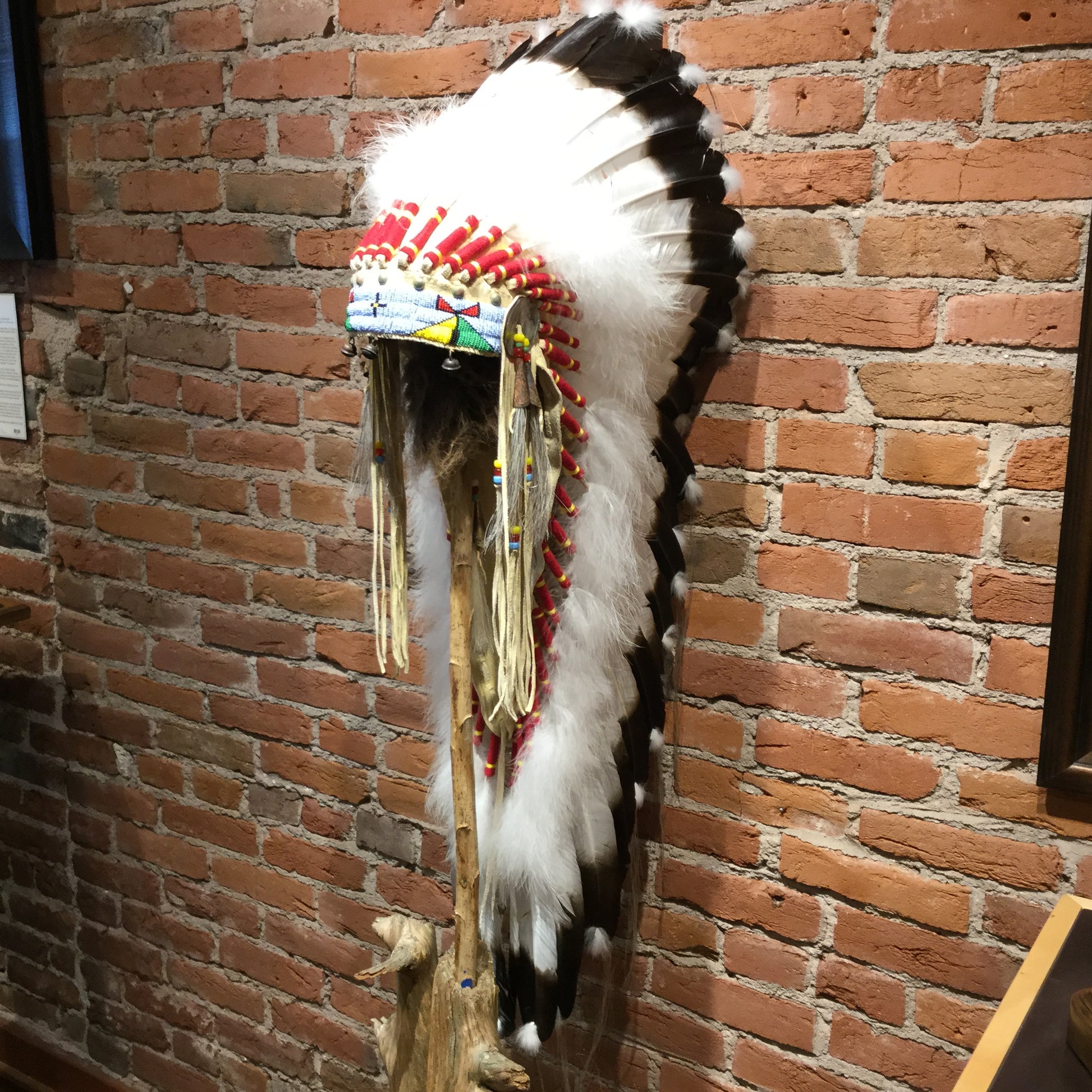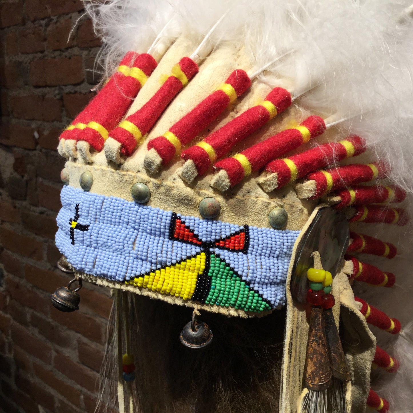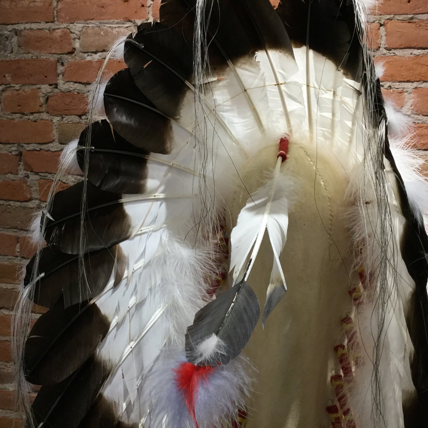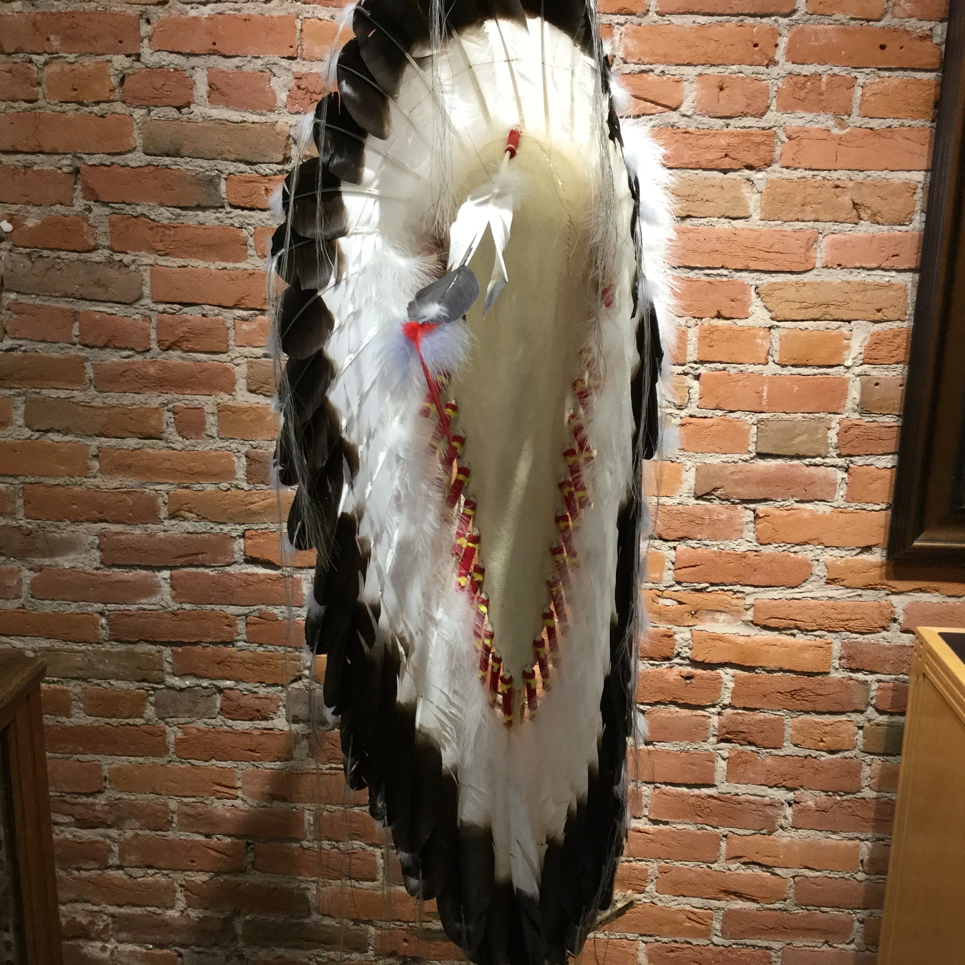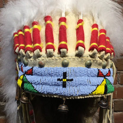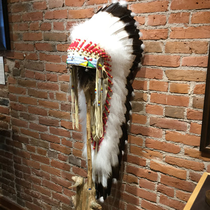 This Victory Headdress is of a plains-style construction. Measuring in at 40" x 12"W x 18"D, this piece is stunning in both size and craftsmanship. Each feather is carefully painted to represent young Eagle Feathers, and each bead is painstakingly stitched into a durable leather base to provide a lifetime of displayed beauty. The style of this Victory Headdress is unique and eye catching. Victory Headdress is Available Without or With Wall Mount Stand.