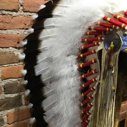 Each headdress we offer is handcrafted with care, guided by traditional designs and the artist’s interpretation of color, balance, and cultural symbolism. These pieces are created to honor the tribes they represent—not as costumes, but as respectful replicas suitable for ceremonial use or meaningful home display. Colors may appear differently depending on your screen settings; if the item is in stock, the photo reflects the exact piece you will receive. If out of stock, images are for reference only and new pieces may vary slightly in pattern or hue. While we do our best to accommodate special requests, changes can only be made using materials and colors already available in our current builds—custom-painted features or themed alterations (e.g., school or wedding colors) are not available. If you would like to pursue a design that blends color and style to match your intended use based on an existing piece, a 50% up-charge will apply to the listed price. Our goal is to respectfully represent the sacred meaning behind these works and to preserve their cultural integrity.