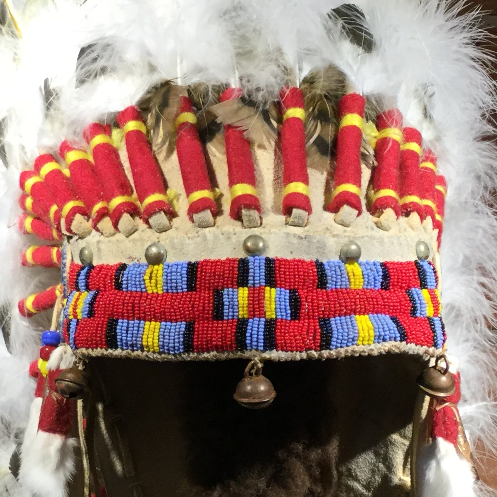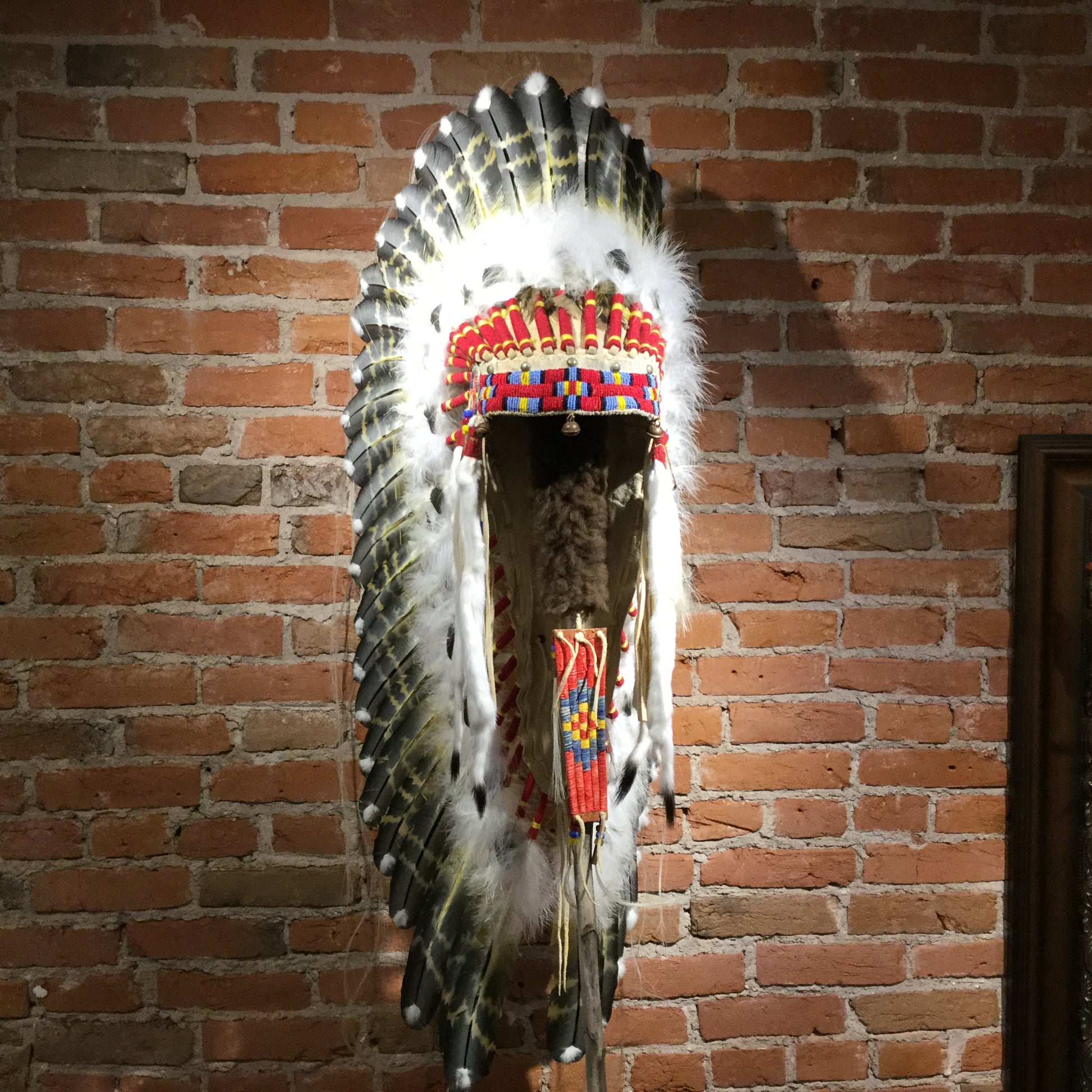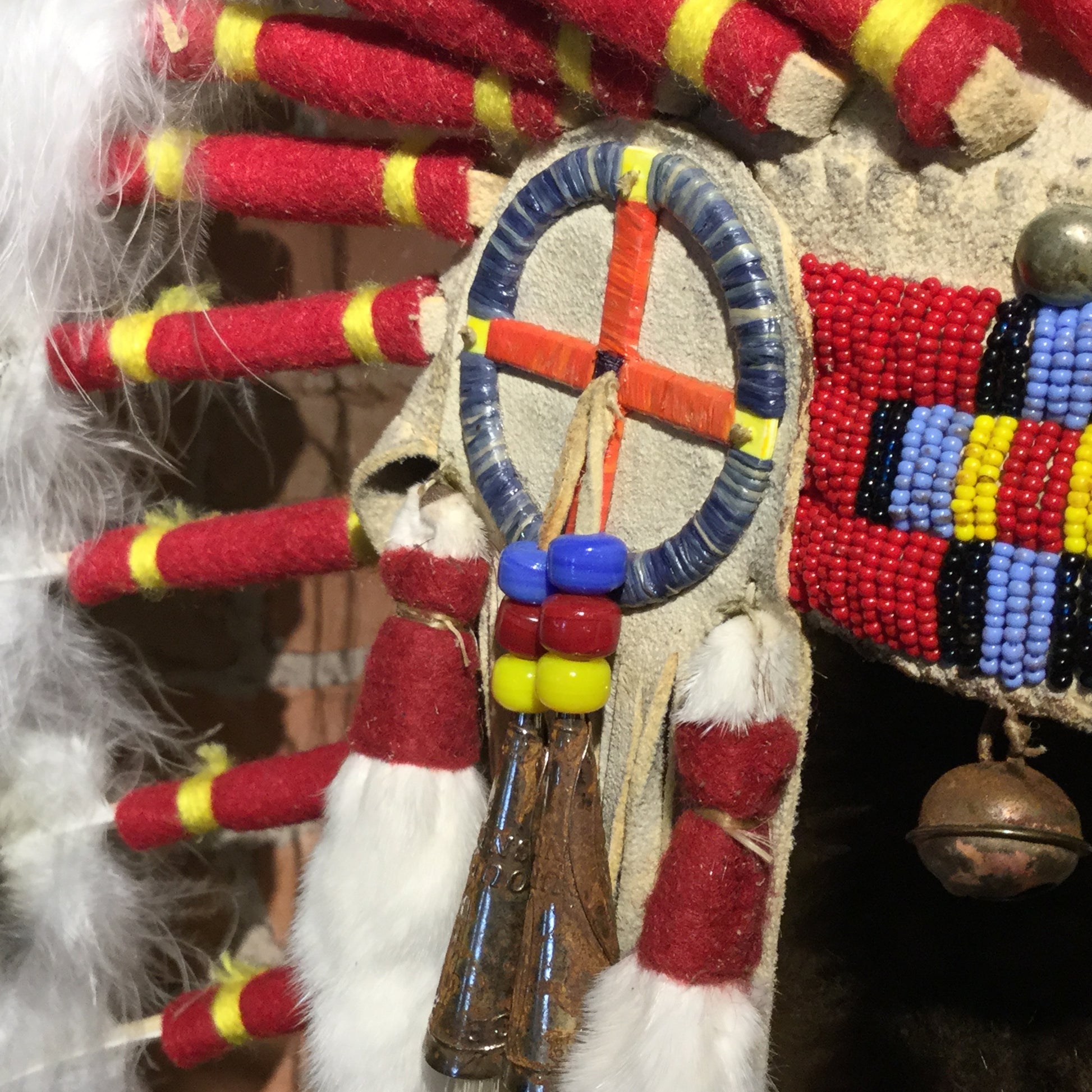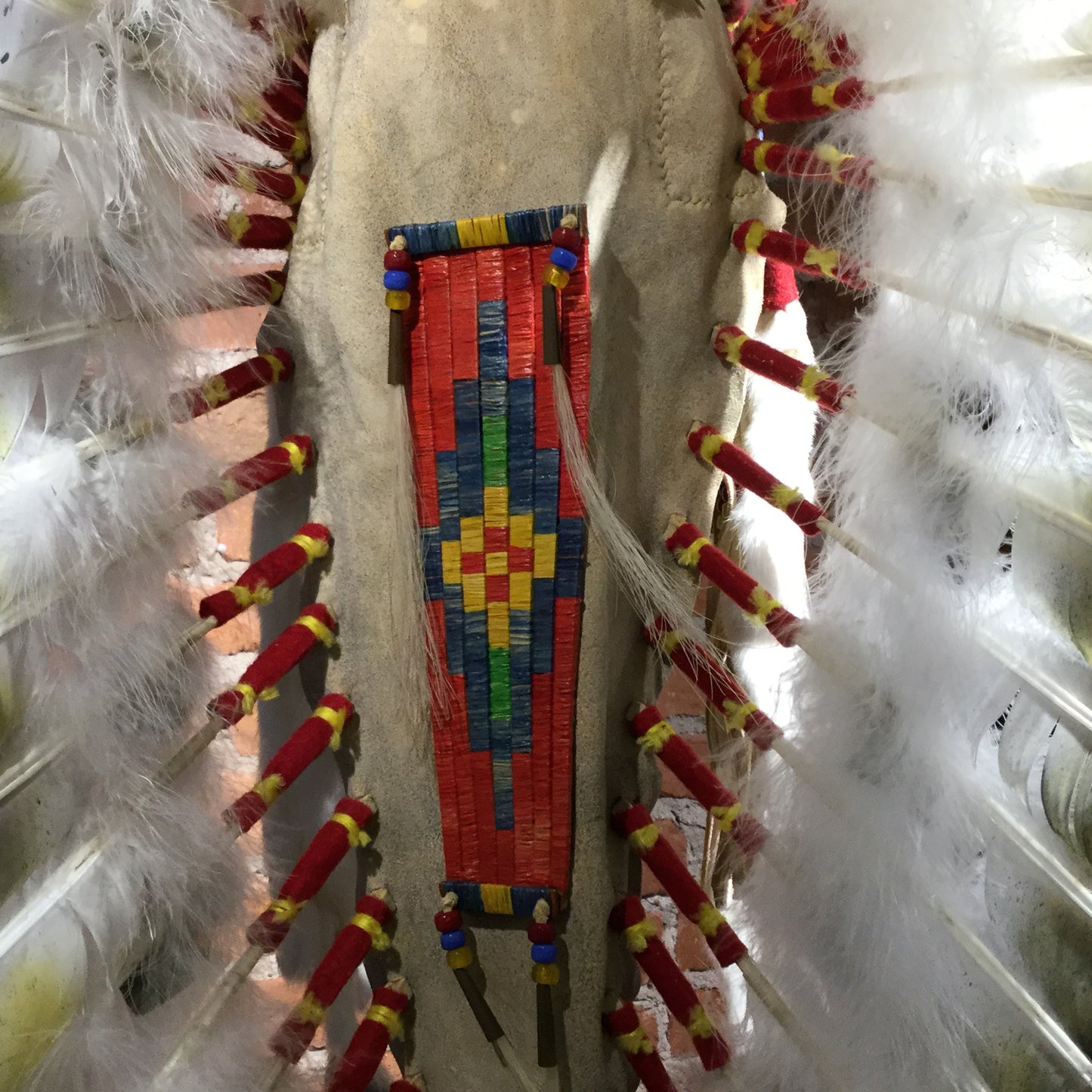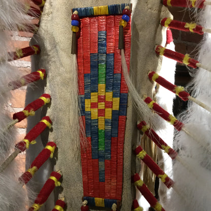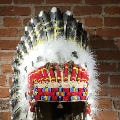 This Victory Headdress is of a plains-style construction. Measuring in at 42"L x 14"W x 20"D, this piece is stunning in both size and craftsmanship. Each feather is carefully painted to represent Mature Eagle Feathers, and each bead is painstakingly stitched into a durable leather base to provide a lifetime of displayed beauty. The style of this Victory Headdress is unique and eye catching. Victory Headdress is Available Without or With Wall Mount Stand.