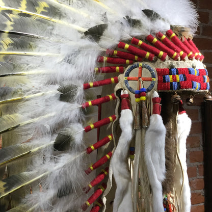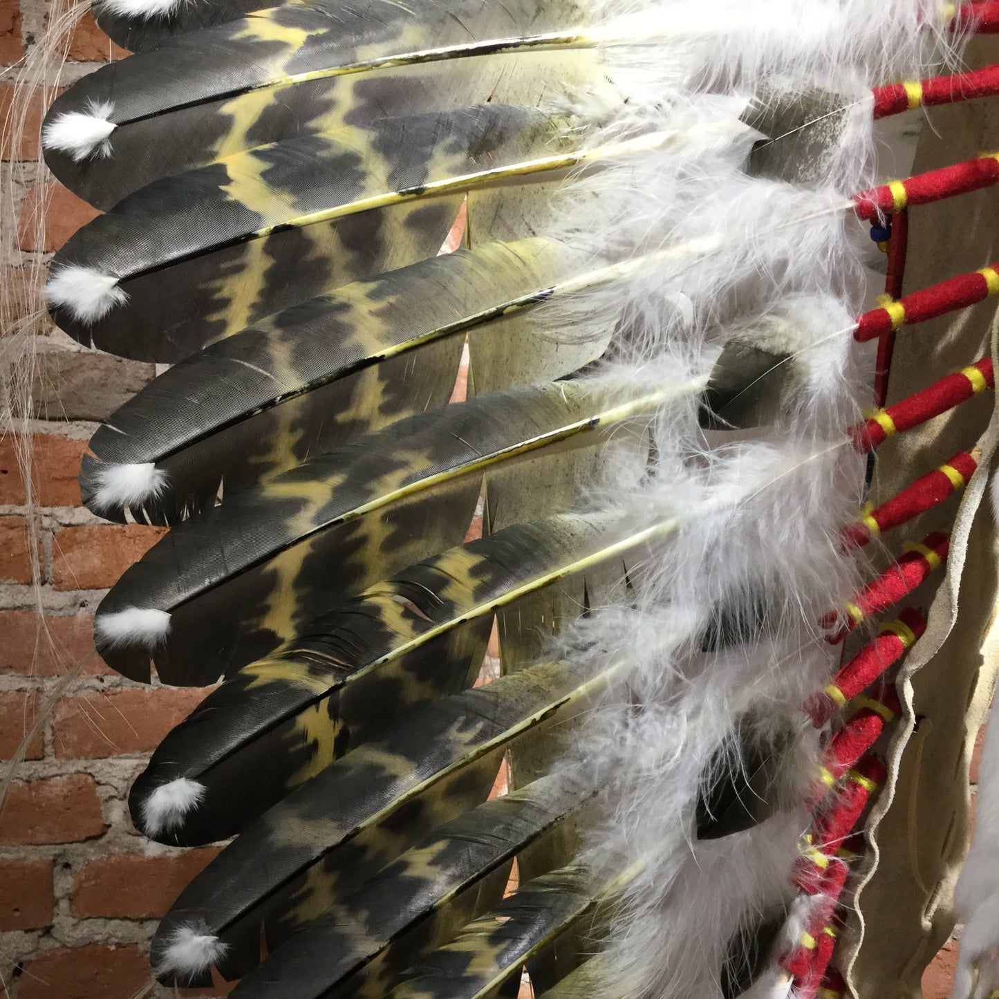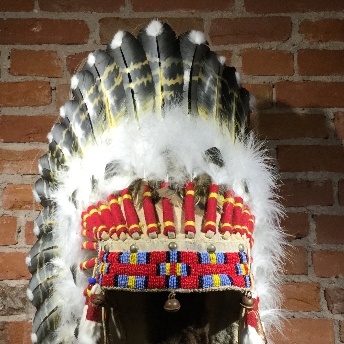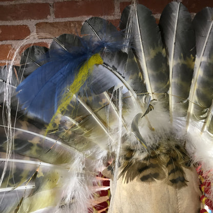 Each headdress we offer is handcrafted with care, guided by traditional designs and the artist’s interpretation of color, balance, and cultural symbolism. These pieces are created to honor the tribes they represent—not as costumes, but as respectful replicas suitable for ceremonial use or meaningful home display. Colors may appear differently depending on your screen settings; if the item is in stock, the photo reflects the exact piece you will receive. If out of stock, images are for reference only and new pieces may vary slightly in pattern or hue. While we do our best to accommodate special requests, changes can only be made using materials and colors already available in our current builds—custom-painted features or themed alterations (e.g., school or wedding colors) are not available. If you would like to pursue a design that blends color and style to match your intended use based on an existing piece, a 50% up-charge will apply to the listed price. Our goal is to respectfully represent the sacred meaning behind these works and to preserve their cultural integrity.