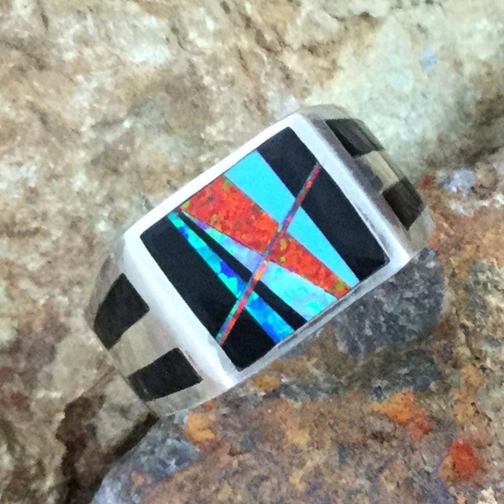 This beautiful Sterling Silver Ring, as part of the Red Moon Collection features Black Jade, Kingman Turquoise and Red, Blue & Green Cultured Opal when ordering.