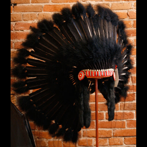 These incredible headdresses are completely handmade by Navajo Artists. This all black headdress are set off by red, white and black beadwork. All headdresses can be worn or displayed and fit an average adult head.