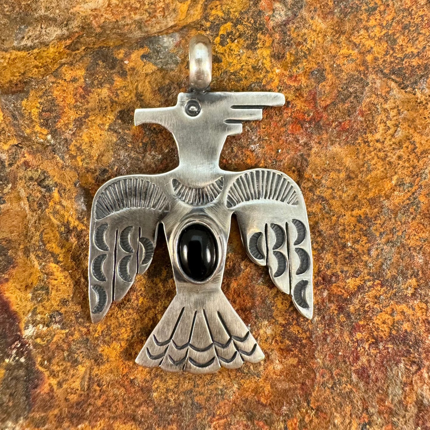 This Sterling Silver Pendant features Black Onyx in a large hand stamped Pendant in a Thunderbird design. Native American Jewelry