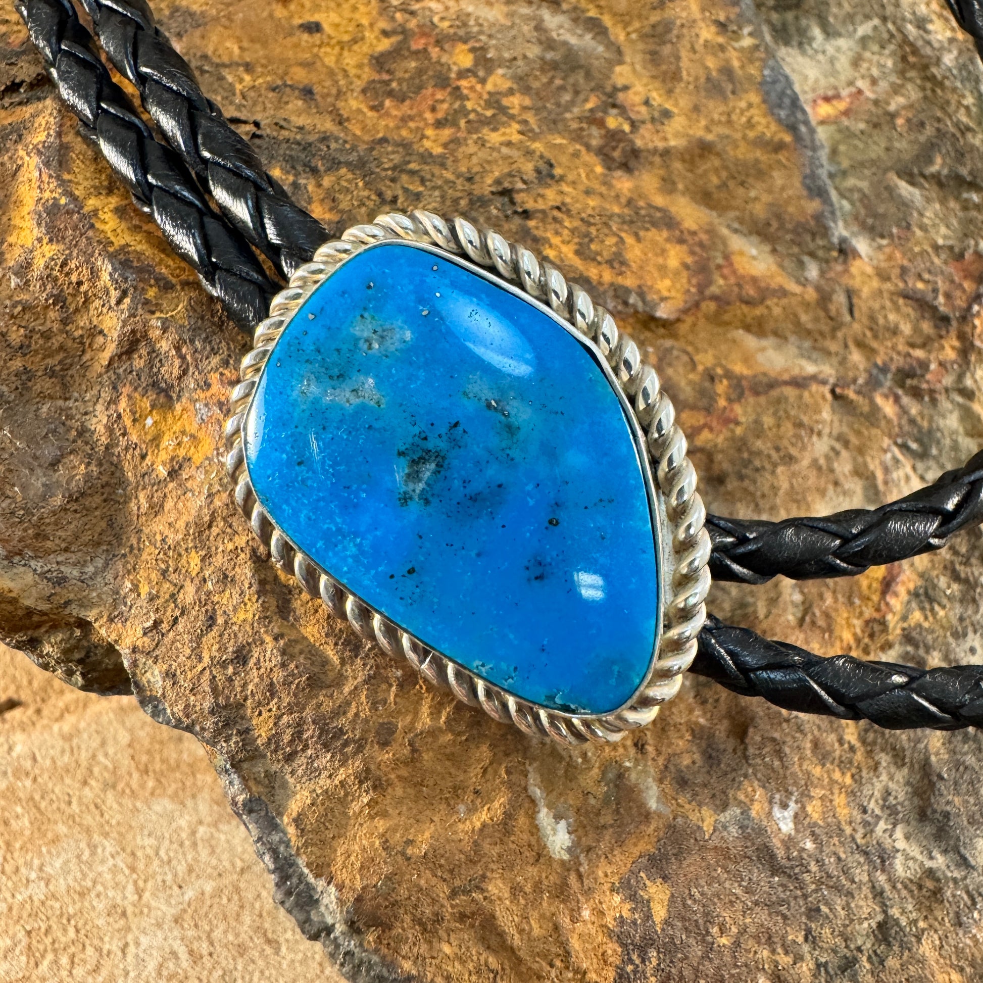 Elevate your western style with this striking Kingman Turquoise bolo tie, crafted for elegance and sophistication. The centerpiece features a polished Kingman Turquoise stone in a captivating sky blue hue, surrounded by a classic sterling silver twisted rope border. Its unique asymmetrical shape adds character, while the black braided leather cord makes it lightweight and comfortable for daily wear. The bolo's size and design make it an excellent choice for ladies seeking a bold yet refined accessory.