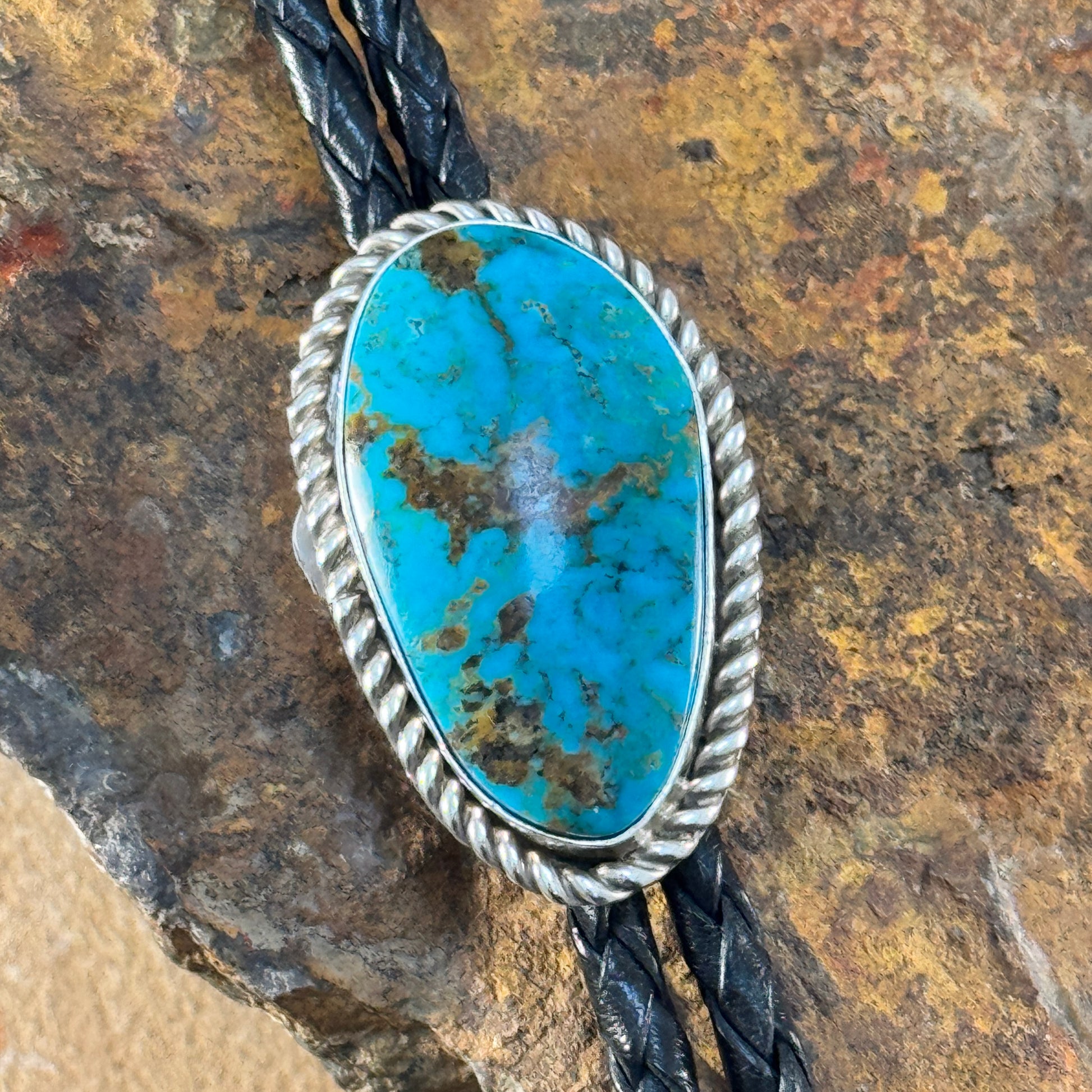This stunning Kingman Turquoise bolo tie is a showcase of vibrant blue hues with natural veining, framed in an elegant sterling silver twist border. The braided black leather cord complements the bold turquoise stone, making it a perfect statement piece for any occasion.