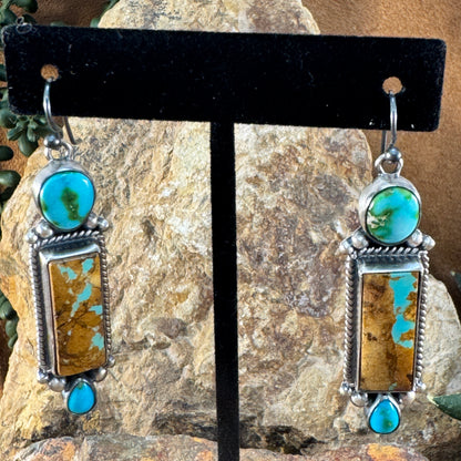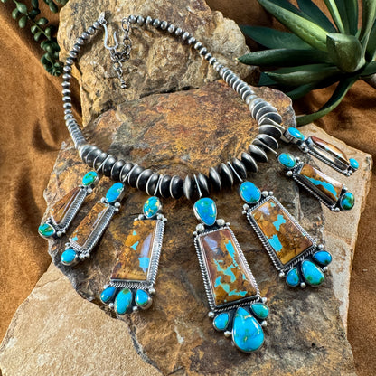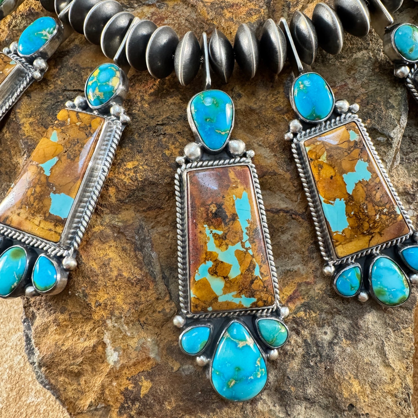 This remarkable set, handcrafted by the talented Native American artist Diane Wylie, combines Boulder and Sonoran turquoise, each stone showcasing a unique blend of earthy browns and vibrant blues and greens. The necklace features five rectangular pendants, each bezel-set with Boulder turquoise, complemented by accents of Sonoran turquoise in rich, bold hues. The matching earrings echo the elegance of the necklace with a similar two-tiered turquoise design framed in sterling silver, creating a harmonious and eye-catching ensemble.