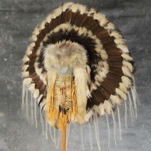 This Brown Prairie Headdress is a reproduction of a Native American artifact with Brown / Beige Feathers and White Fluffs. It was created and handcrafted by Navajo Artists such as Linda Lee, Betsy Piaso and others. Their artistry includes intricate bead work and painted feathers.