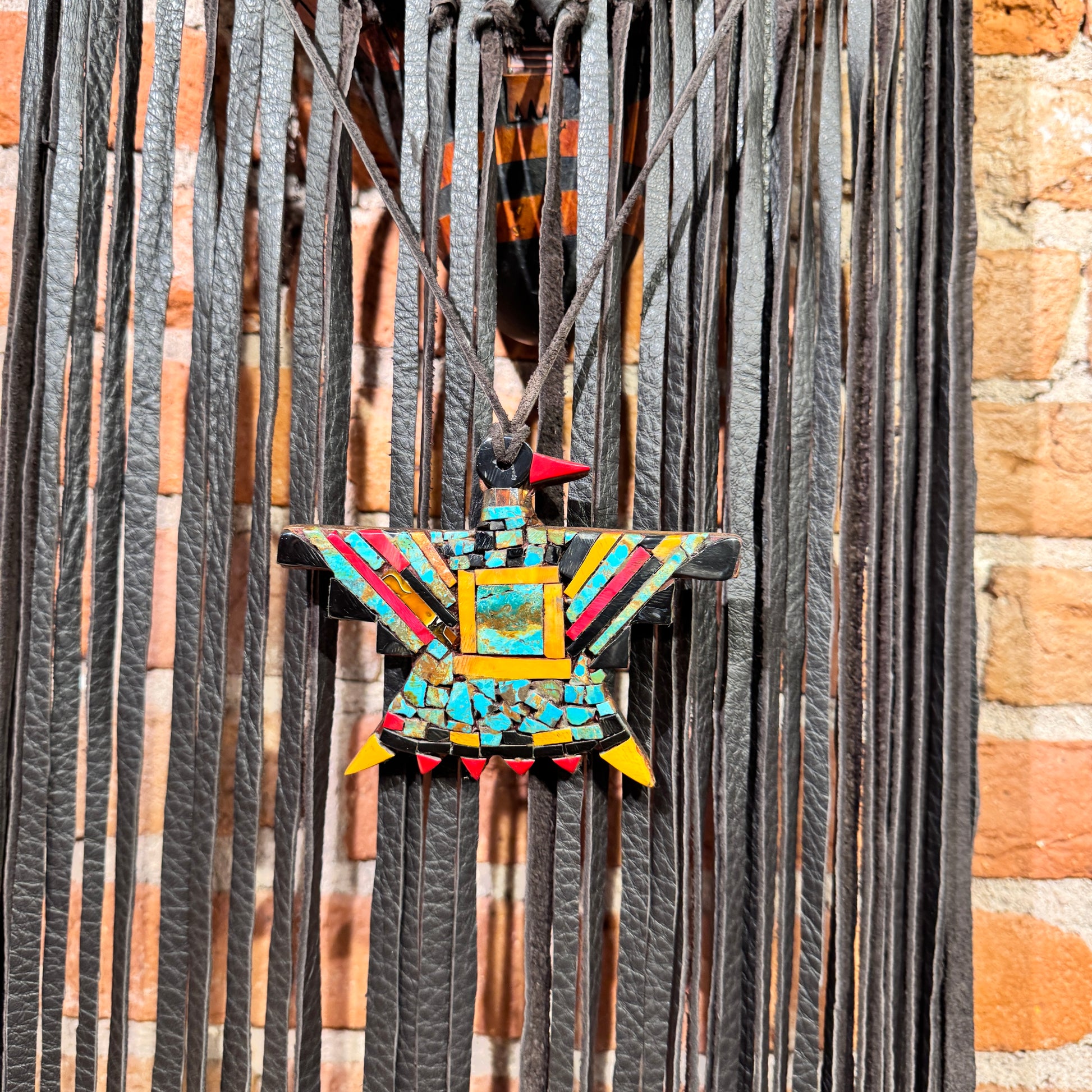 A dramatic large-format buffalo mask carved from a gourd and adorned with long leather fringe, inlaid turquoise, and intricately painted patterns. The bold horns and layered texture give this piece extraordinary presence—ideal for a statement wall.