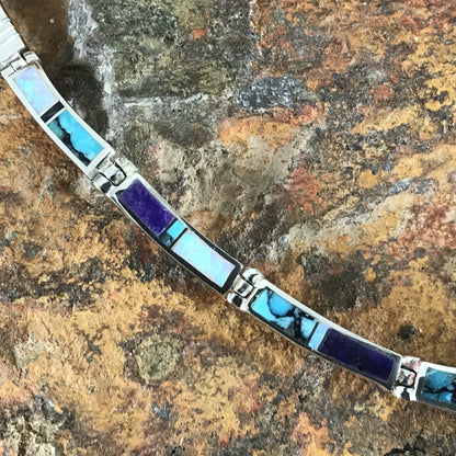 This gorgeous Sterling Silver Link Necklace shown in the Shalako Collection features Sugilite, Tibetan Turquoise and Lap Opal.