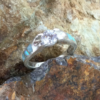 This beautiful Sterling Silver Ring, as part of the Amazing Light Collection, features Amazonite and Lab Opal with a oval center stone of Cubic Zirconia.
