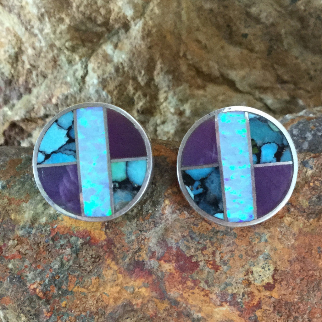 These gorgeous Sterling Silver Earrings, as part of the Shalako Collection features Inlay of Sugilite, Tibetan Turquoise and Lab Opal.