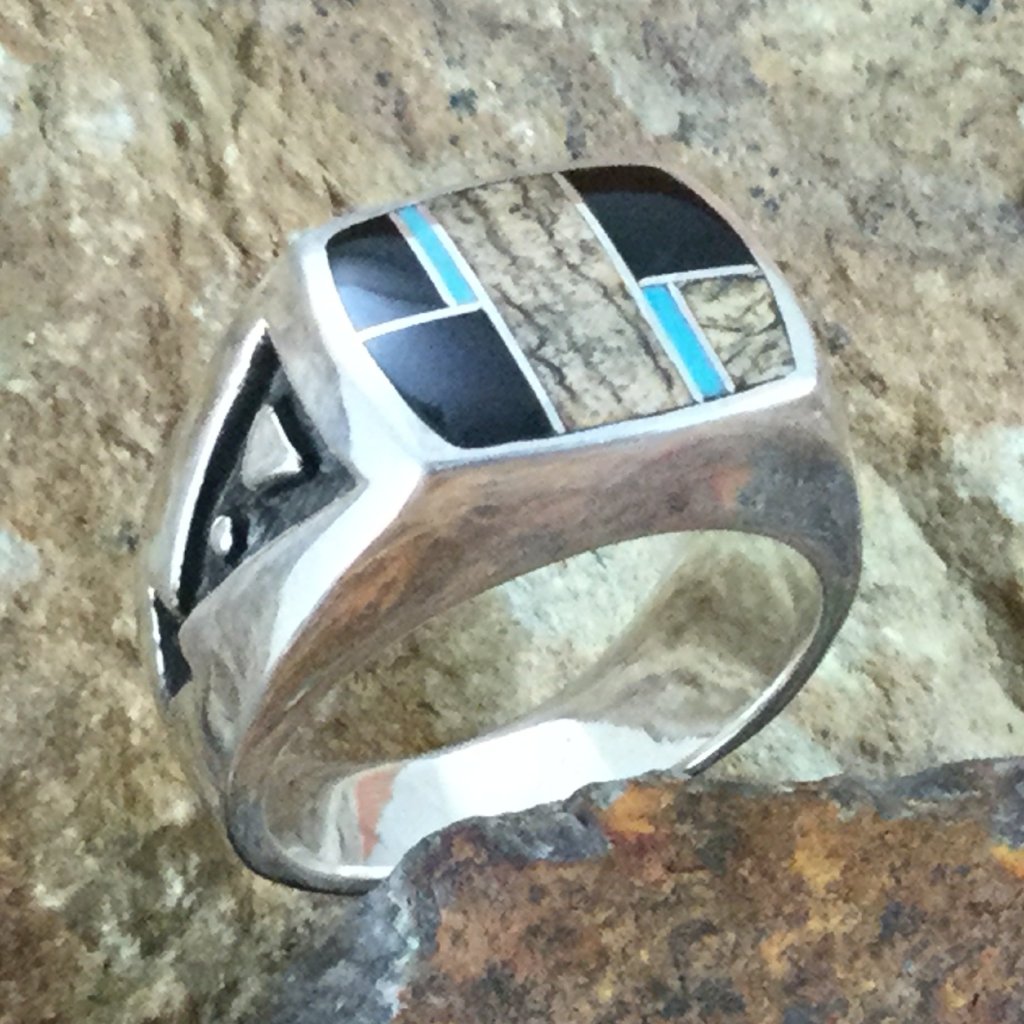 This beautiful Sterling Silver Ring, as part of the Turquoise Creek Collection, features Black Jade, Picture Jasper, and Kingman Turquoise.