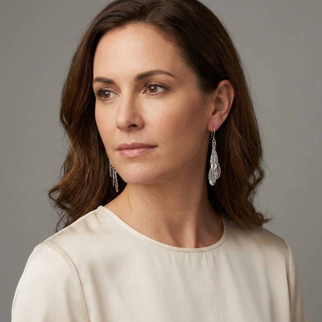 These stunning dangle feather earrings are handcrafted by Santo Domingo artist Ray Coriz, showcasing the timeless beauty of Native American jewelry traditions. Each delicate feather is meticulously shaped and finished, creating graceful movement that catches the light with every turn.