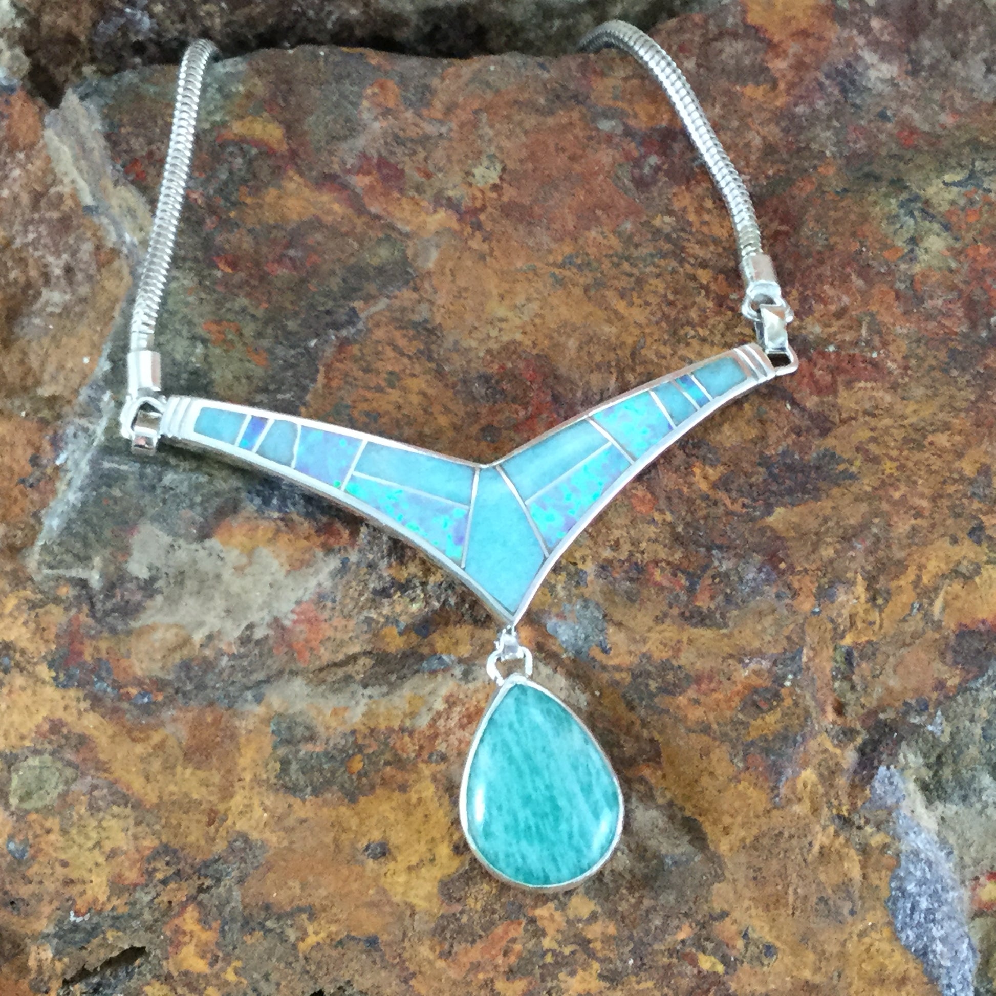 This gorgeous Sterling Silver Necklace shown in the Amazing Light collection, features Amazonite and Lab Opal with a Cabachon of Amazonite.