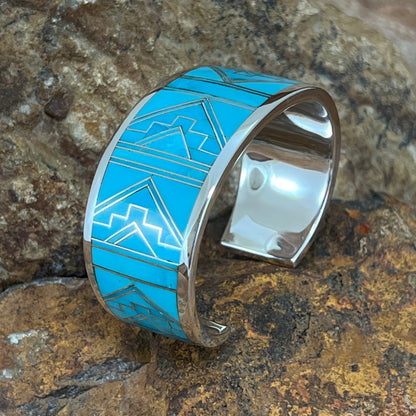This Beautiful Sterling Silver Bracelet, is shown as part of the Arizona Blue collection, featuring Kingman Turquoise in a Fancy Inlaid Pattern. Choose Bracelet Size based on Total Circumference of Wrist.