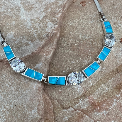 This gorgeous Sterling Silver Necklace, as part of the Arizona Blue Collection features Kingman Turquoise in a Two Tone Fancy Inlay Pattern, as well as 3 large oval Cubic Zirconia Gemstones. Includes Omega Chain.