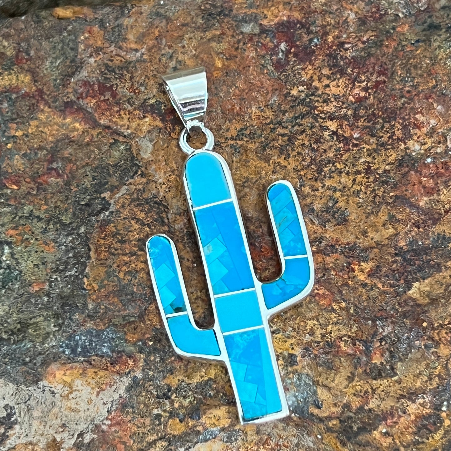 Ask a question about David Rosales Arizona Blue Fancy Inlaid Sterling Silver Pendant Cactus