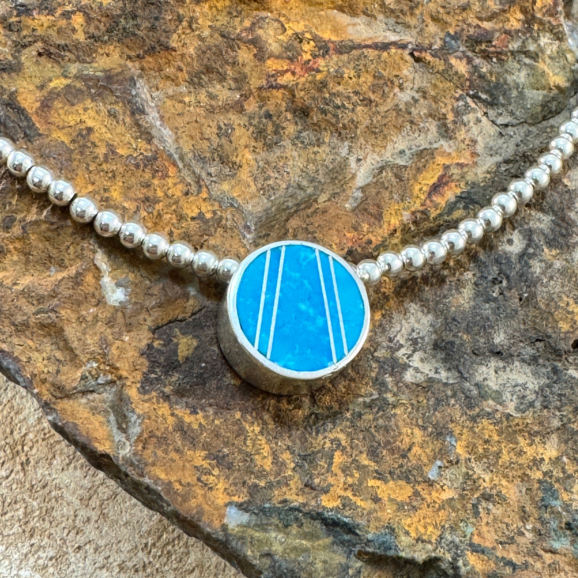 This stunning necklace as part of the Arizona Blue collection features a Kingman Turquoise inlaid pendant paired with polished sterling silver beads for a sleek and modern design. The vibrant blue turquoise with delicate silver inlay lines creates a striking focal point that highlights the craftsmanship of this piece.