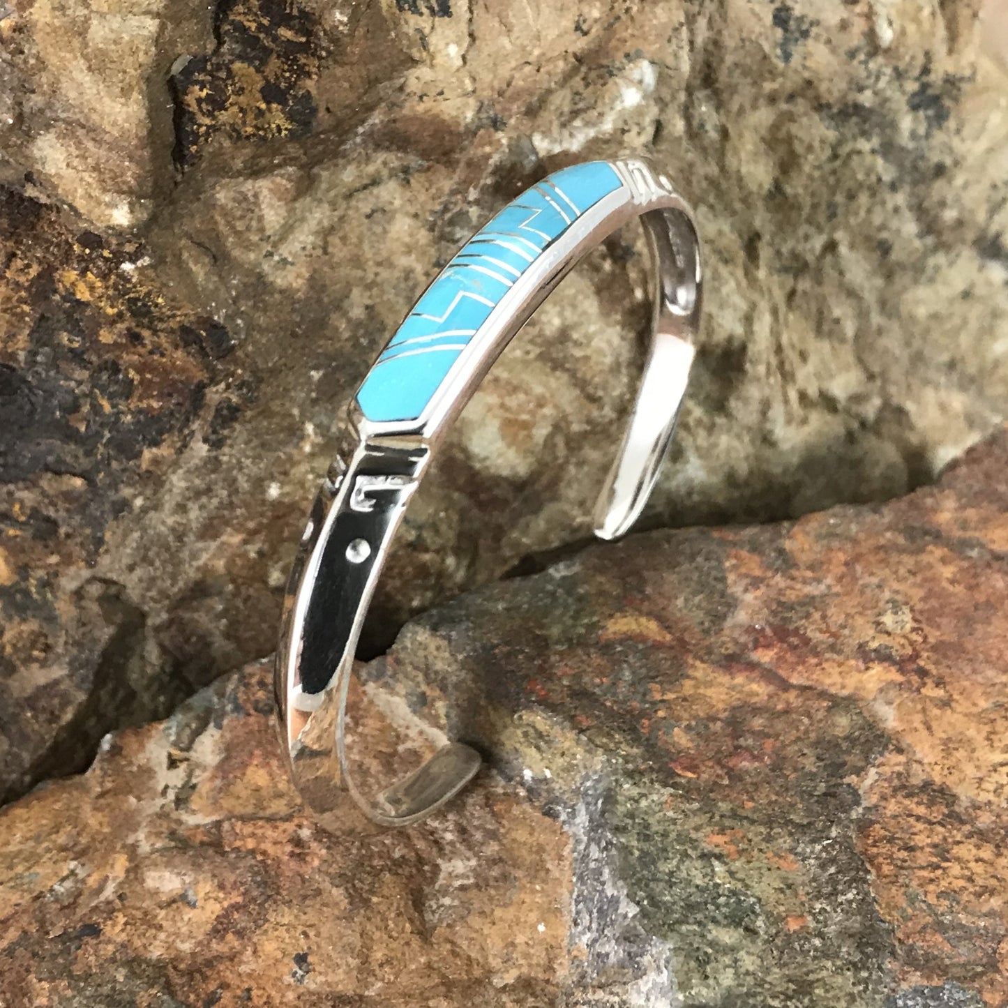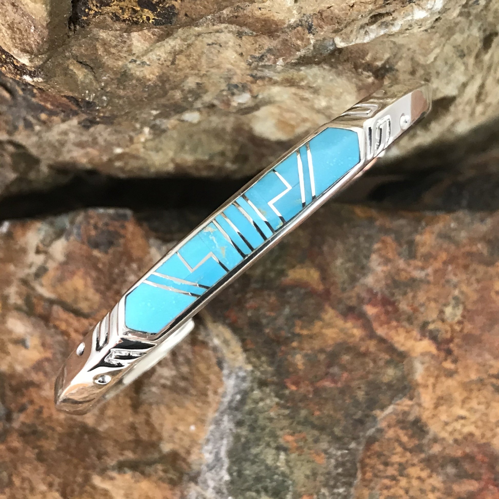 This Beautiful Sterling Silver Bracelet shown in the Arizona Blue Collection features Kingman Turquoise in a Inlay Pattern.