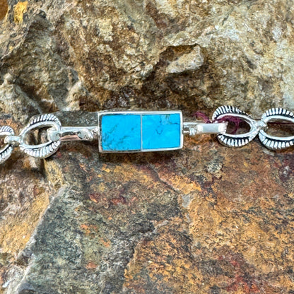 This gorgeous Sterling Silver Necklace, as part of the Arizona Blue collection has 5 individual stones showcasing the spectacular Blue of Kingman Turquoise from Arizona. It features a Double End Clasp with a Kingman Turquoise Stone setting, allowing for equal length chain drops on each side of the Clasp.