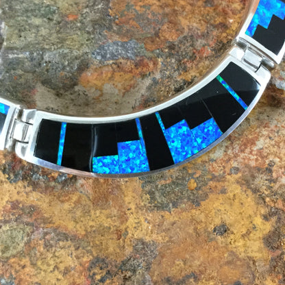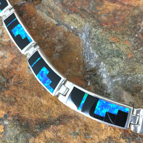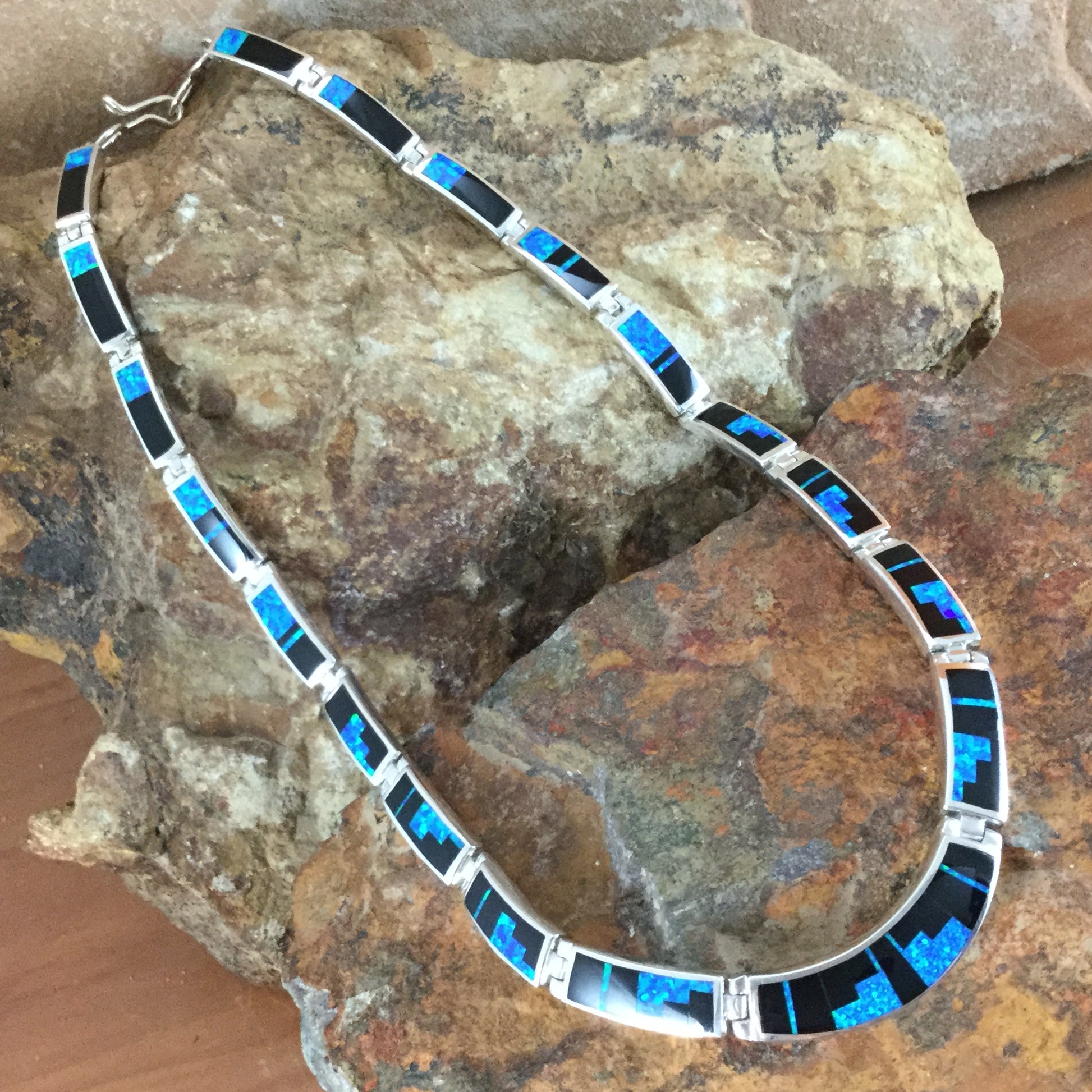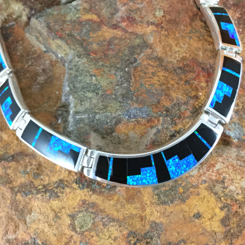 This gorgeous Sterling Silver Necklace, as part of the Black Beauty Collection features Black Jade and Blue Cultured Opal in a Fancy Inlay Pattern.