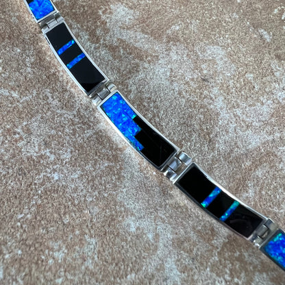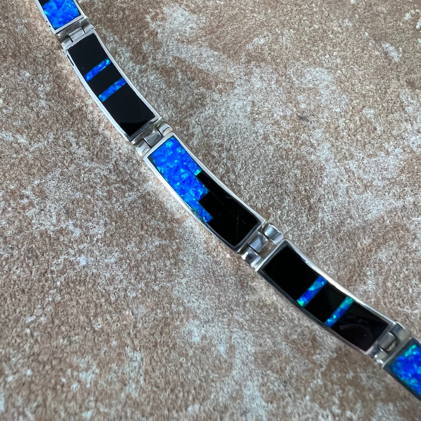 This gorgeous Sterling Silver Necklace, as part of the Black Beauty Collection, features Black Jade and Lab Opal in a Fancy Inlay Pattern.