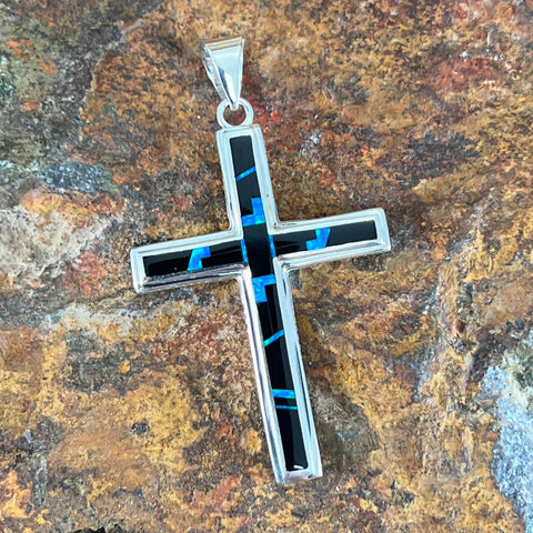 David Rosales Black Beauty Fancy Inlaid Sterling Silver Pendant Cross