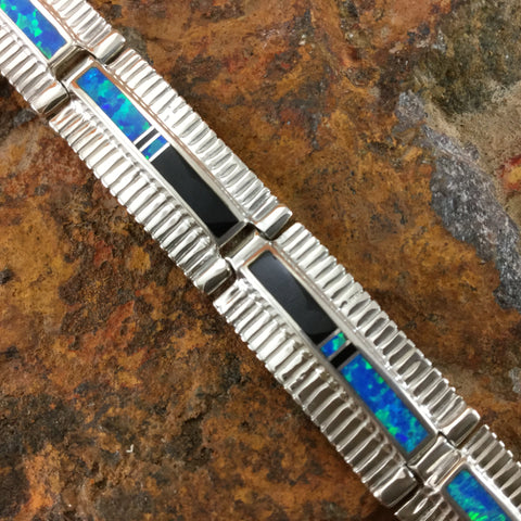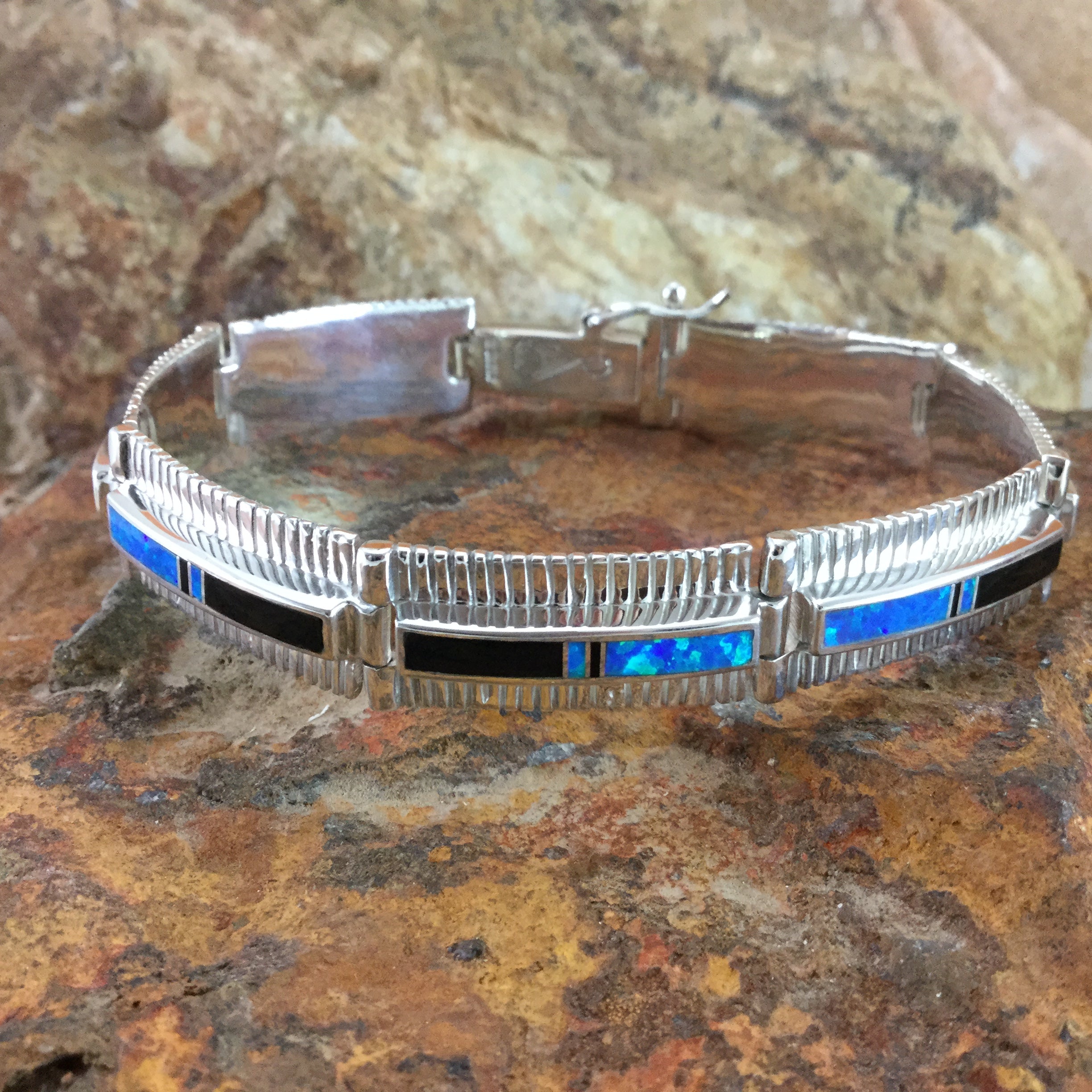 This beautiful Sterling Silver Bracelet is shown as part of the Black Beauty collection, features an Inlay pattern with Black Jade and Lab Opal.