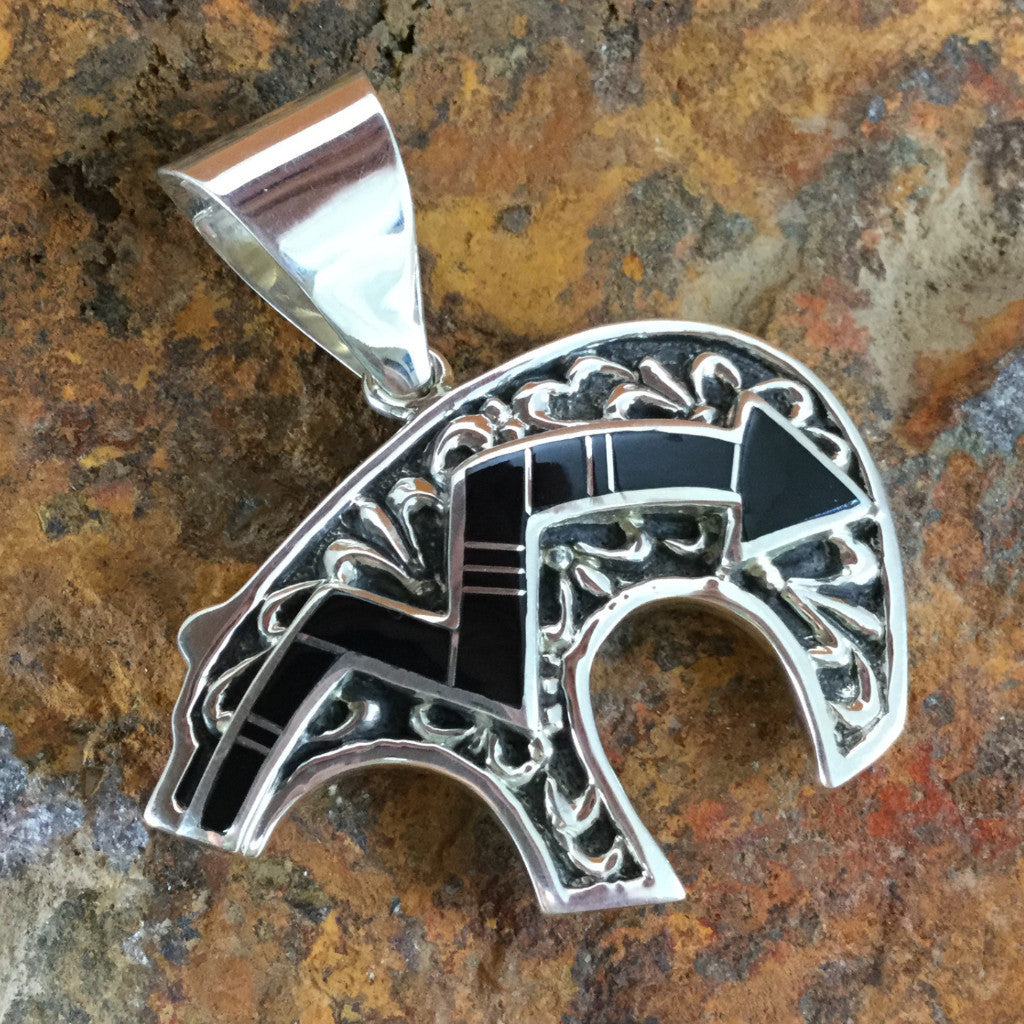 David Rosales Black Jade Inlaid Sterling Silver Pendant Bear