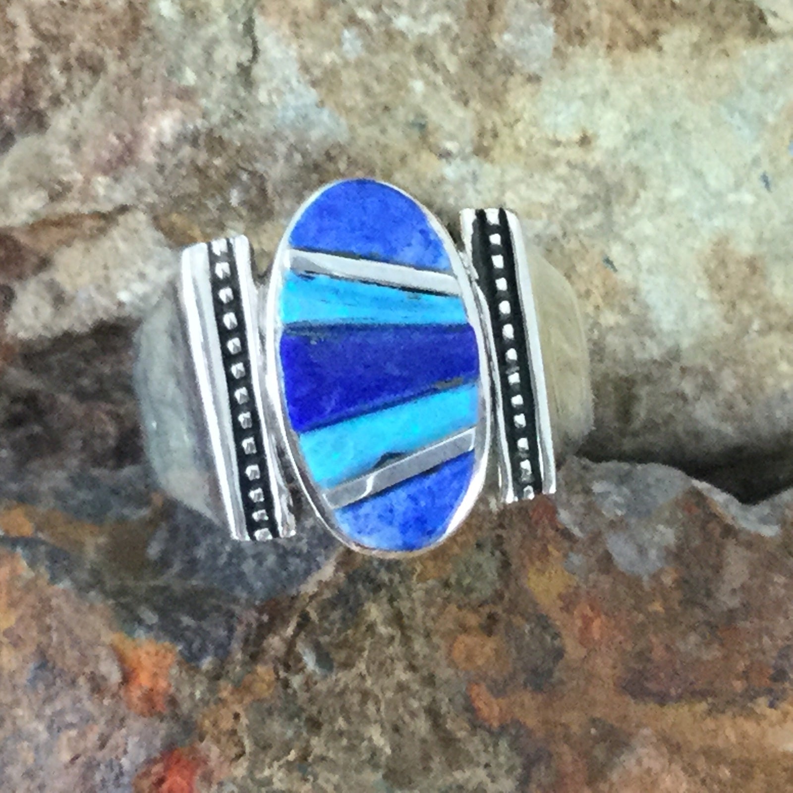 This beautiful Sterling Silver Ring, as part of the Blue Sky Collection, features Royal Lapis, Denim Lapis and Cultured Opal in a Cobble Finish.