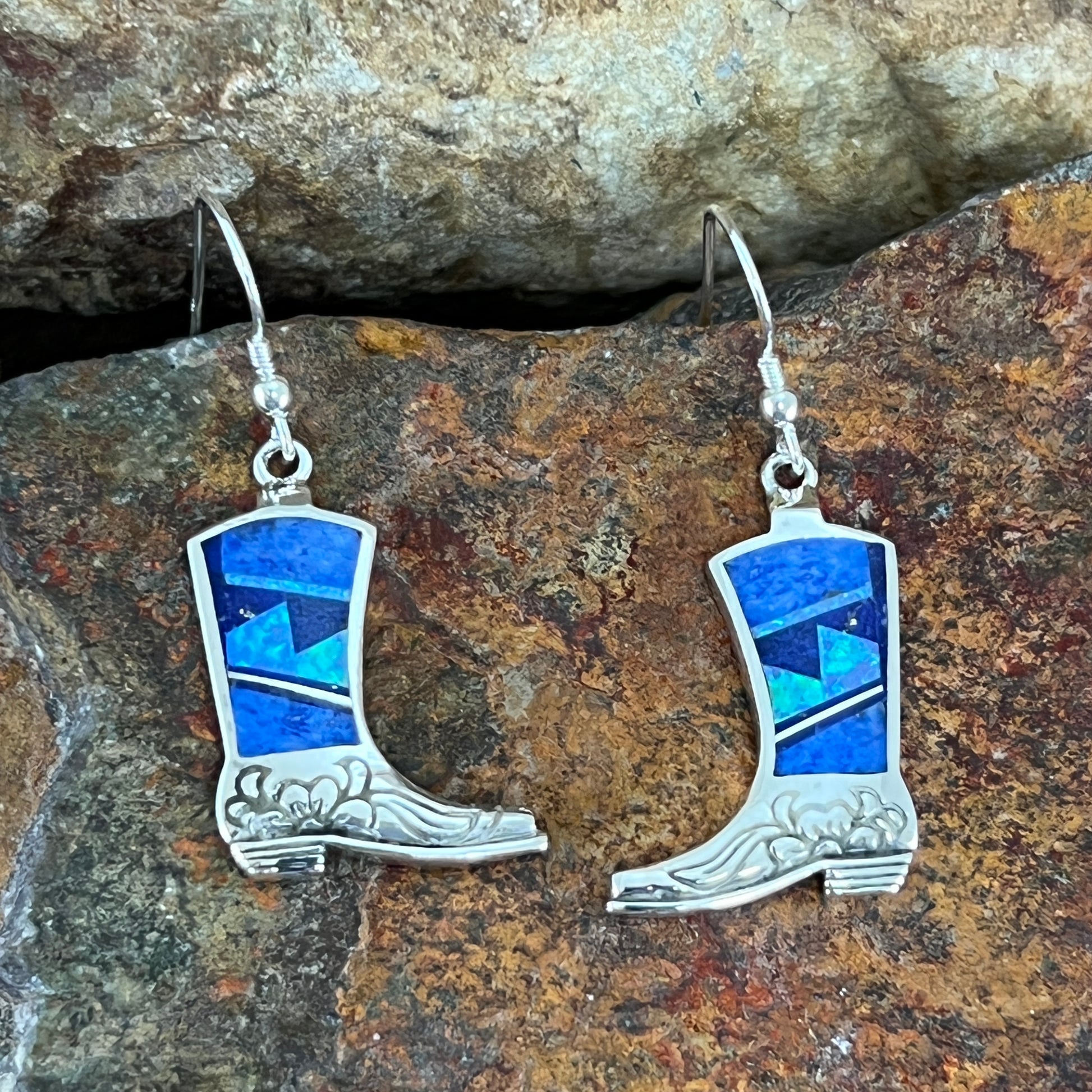 These gorgeous Sterling Silver Earrings Cowgirl Boots, as part of the Blue Sky Collection which feature Royal Lapis, Denim Lapis and Cultured Opal in a Fancy Inlaid Pattern.