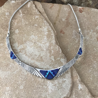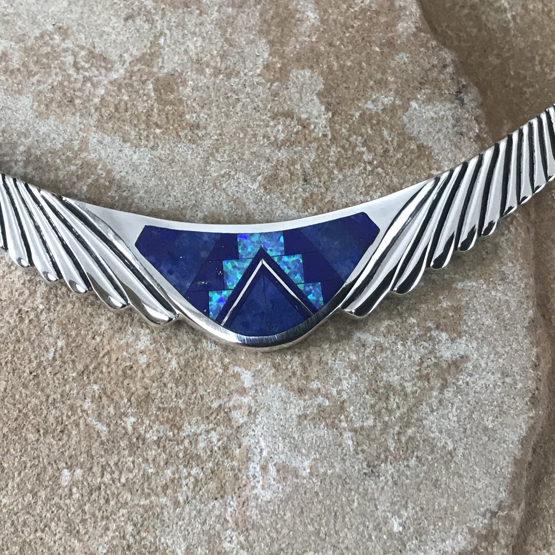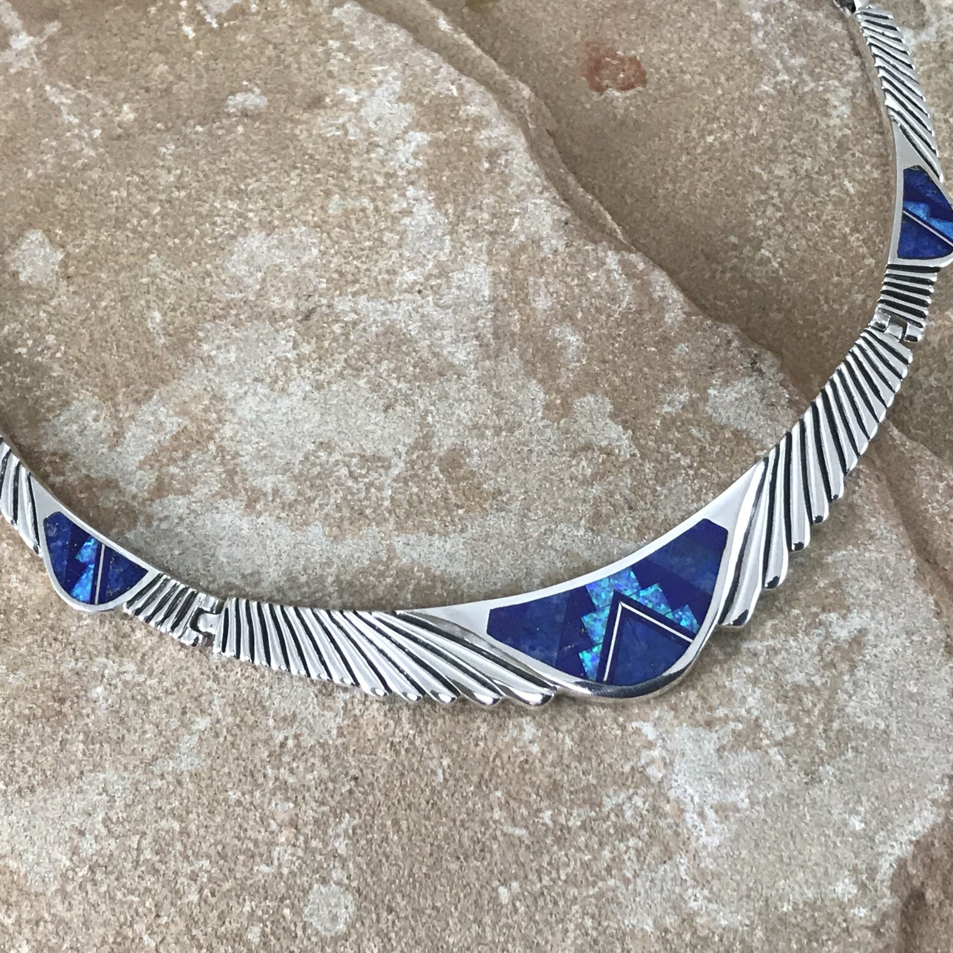This gorgeous Sterling Silver Necklace, as part of the Blue Sky Collection which features Royal Lapis, Denim Lapis and Cultured Opal in a Fancy Inlay pattern.