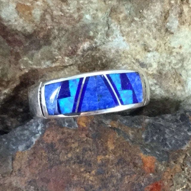 This beautiful Sterling Silver Ring, as part of the Blue Sky Collection, features Royal Lapis, Denim Lapis and Cultured Opal in a Fancy Inlaid Pattern.