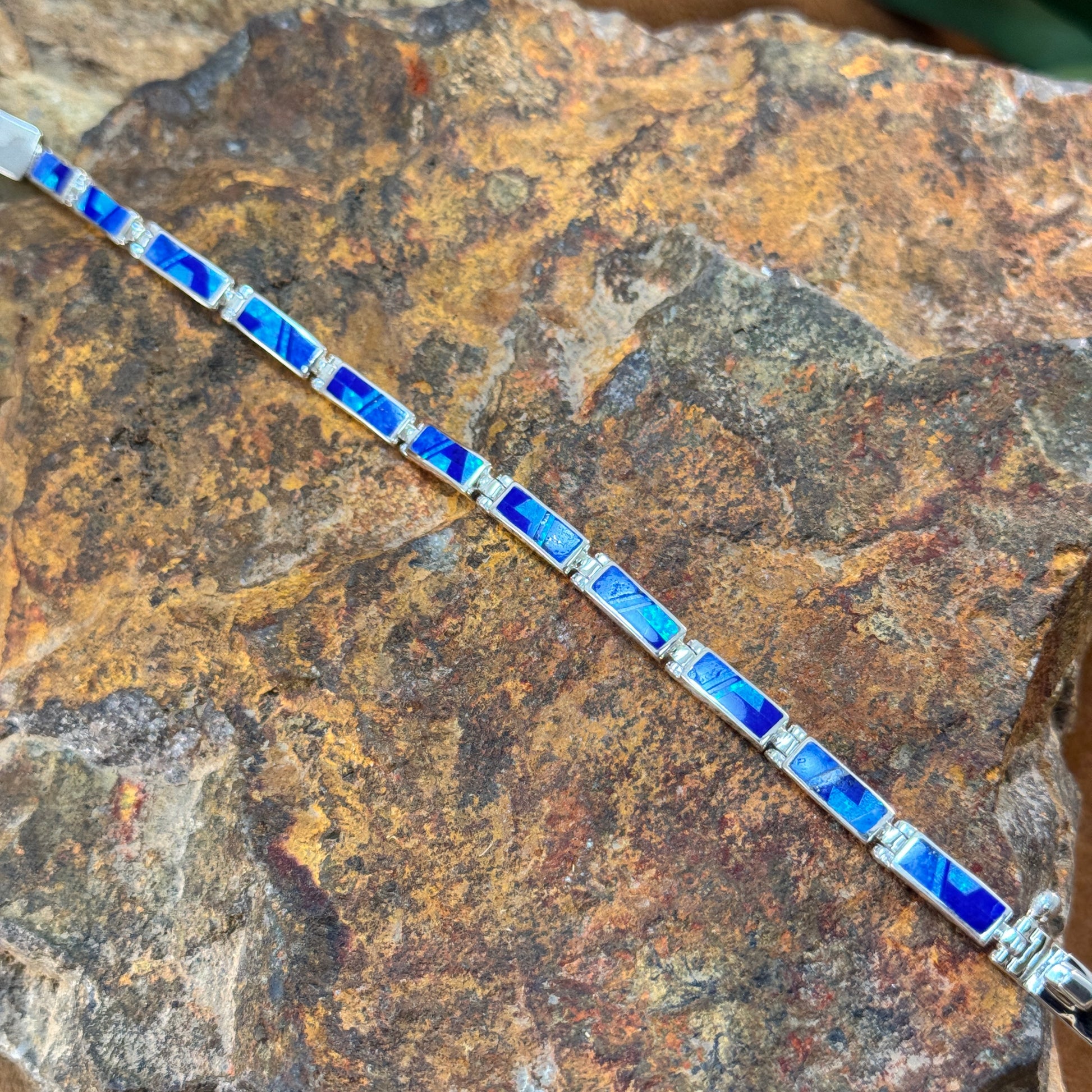 This Beautiful Sterling Silver Link Bracelet as part of the Blue Sky Collection, features Royal Lapis, Denim Lapis and Cultured Opal.