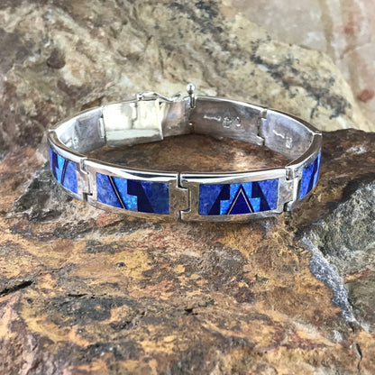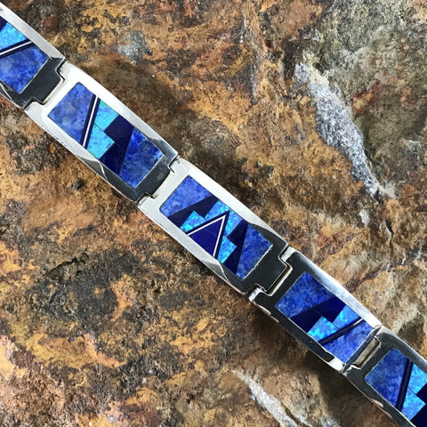 This Beautiful Sterling Silver Bracelet, as part of the Blue Sky Collection, features Royal Lapis, Denim Lapis and Cultured Opal in a Fancy Inlaid Pattern.