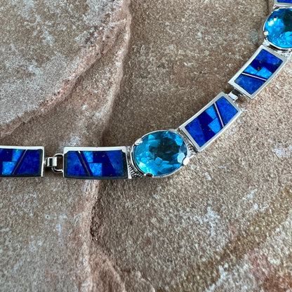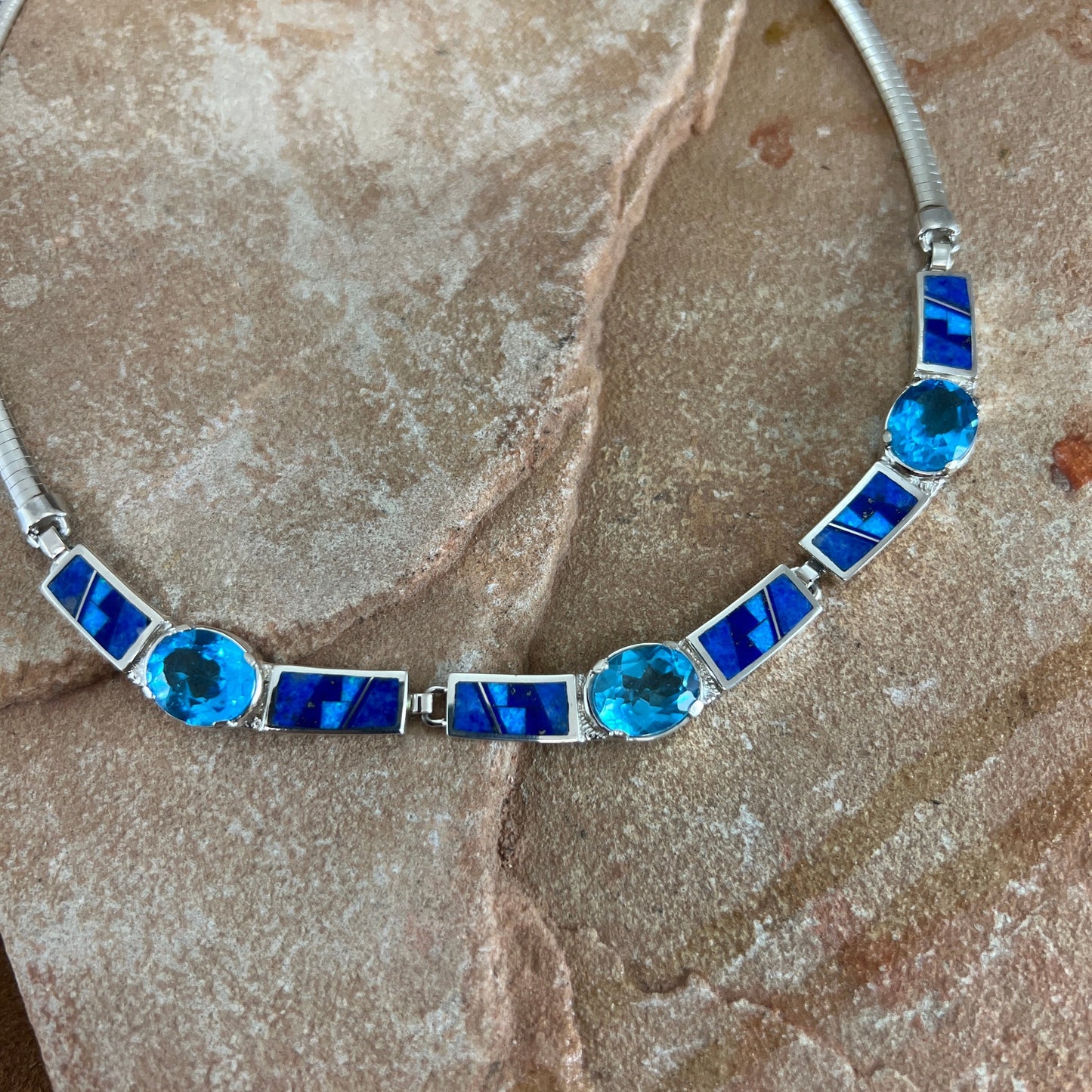 This gorgeous Sterling Silver Necklace, as part of the Blue Sky Collection, features Royal Lapis, Denim Lapis and Cultured Opal in a Fancy Inlaid Pattern, as well as 3 large Blue Topaz Gemstones. Includes Omega Chain.